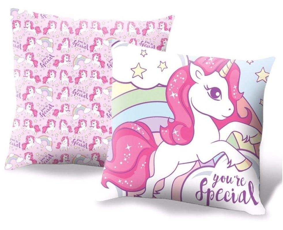 EUROSWAN Blazina Unicorn 40/40 100 % poliester Velikost: 1× 40/40 cm Otroška blazina je izdelana iz 100-odstotnega poliestra in ima polnilo, ki je tesno všito v notranjost. Celoten opis