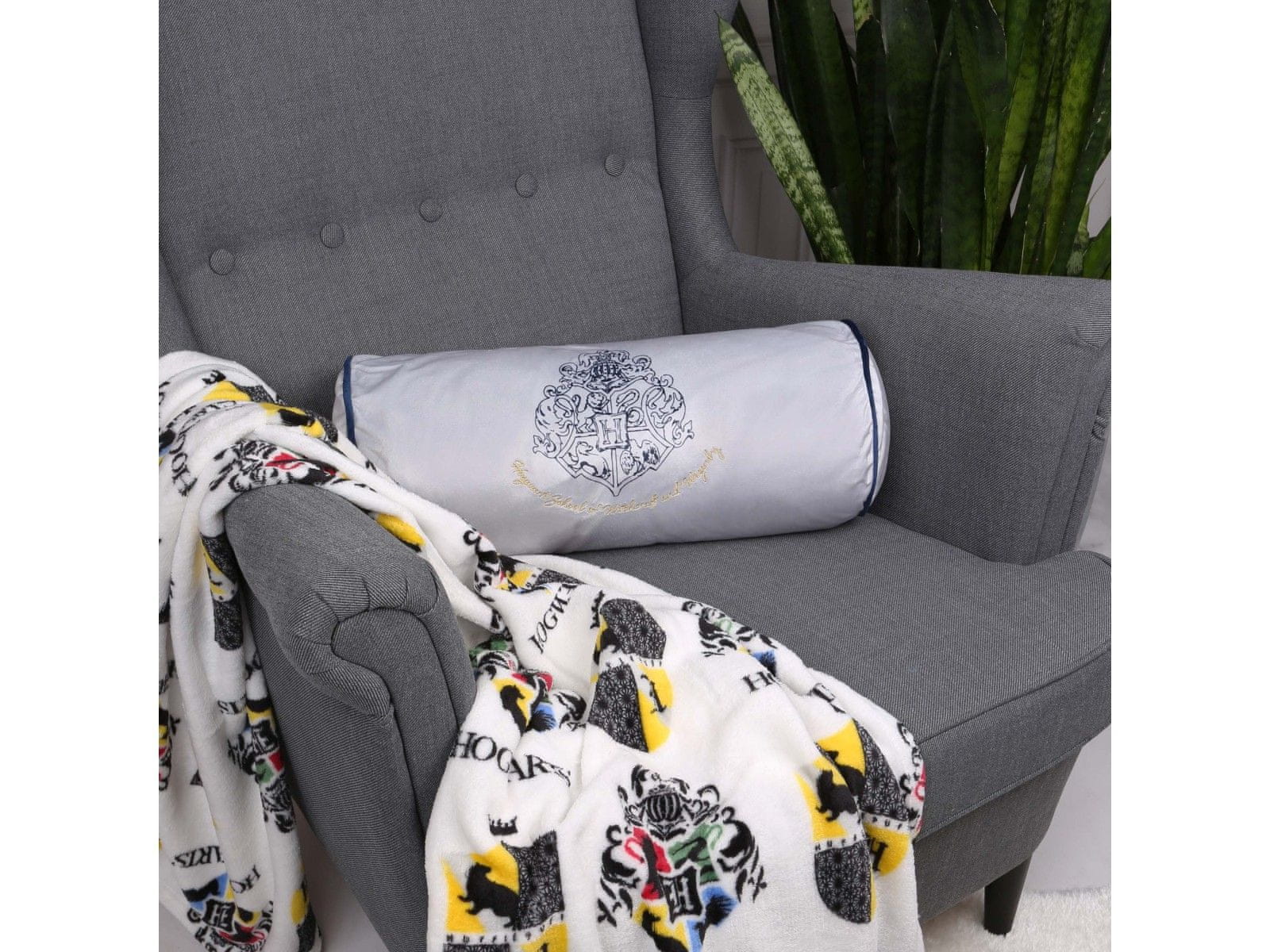 Srebrna blazina v obliki valja, z ene strani z natisnjenim grbom Šole čarovništva in magije v Hogwartsu.Zapira se z zadrgo, ki omogoča odstranitev polnila in pranje prevleke.Odlična kot dekorativni dodatek v sobi, uporabna tudi v postelji ali na potovanju.Izdelana iz zelo mehkega, prijetnega in trpe Celoten opis