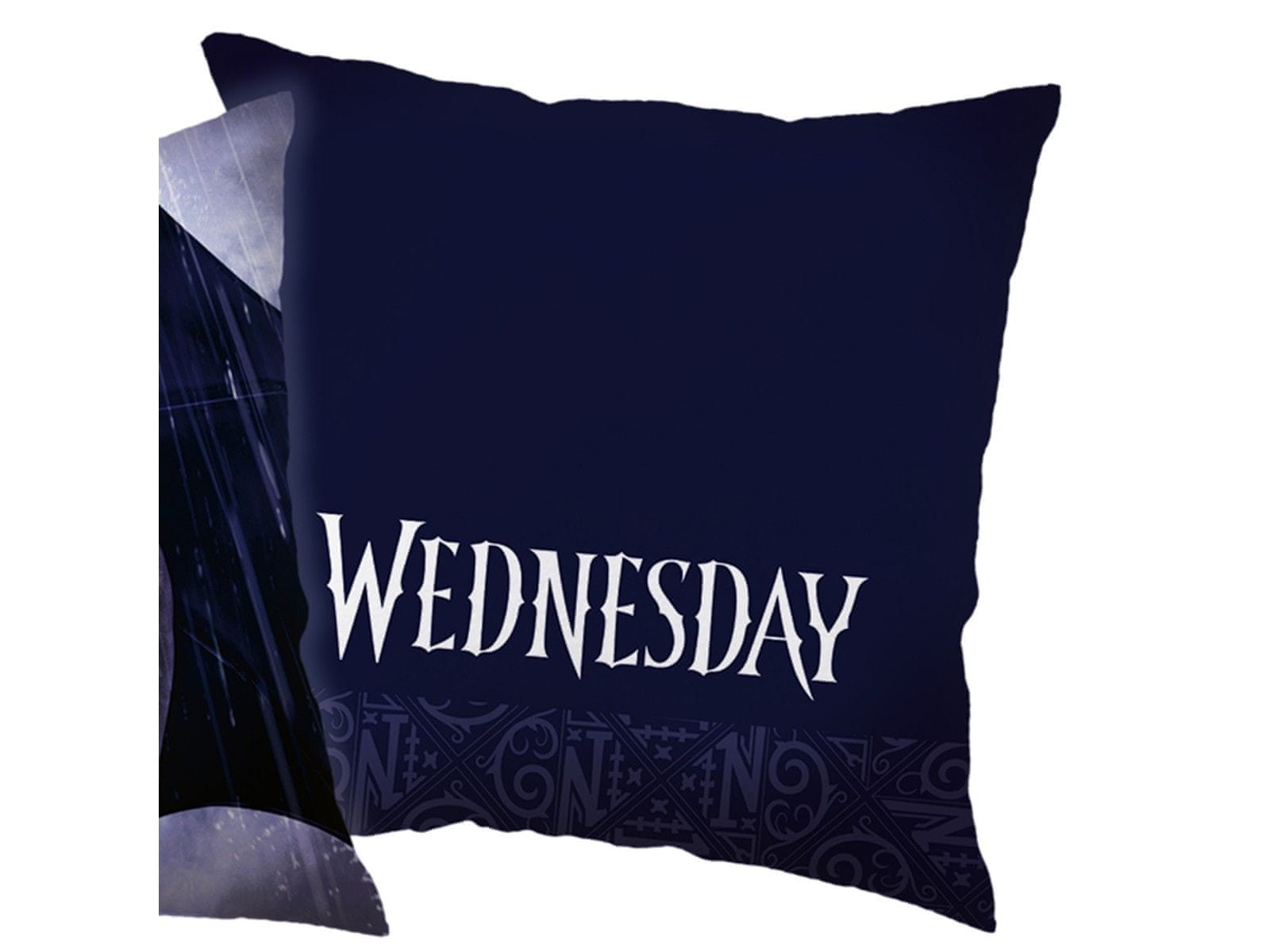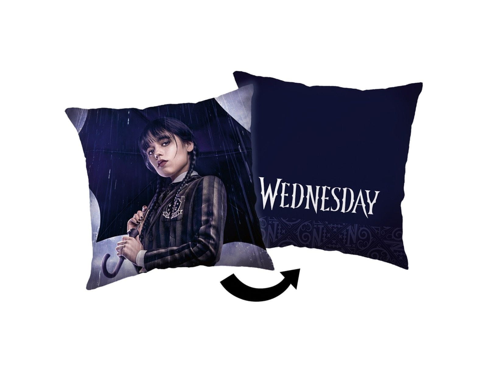 Ta dvostranska okrasna blazina z motivom Wednesday Addams je odlična izbira za ljubitelje gotskega sloga in serije „Wednesday“.Na eni strani je grafična podoba glavnega junaka z dežnikom v deževnem okolju, na drugi strani pa eleganten napis „Wednesday“ na temnem ozadju.Izdelan je iz mehkega material Celoten opis