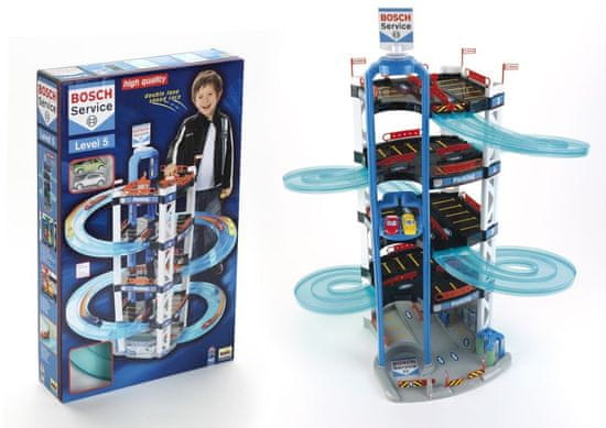 Boschova garaža, 5 nadstropij. Sodobna garaža z bencinskim servisom in avtopralnico. Z vrha lahko avtomobili dirkajo, kdo bo prvi prišel dol. Vključena sta dva avtomobila, višina 85 cm. Primerno za otroke od 3. leta starosti.