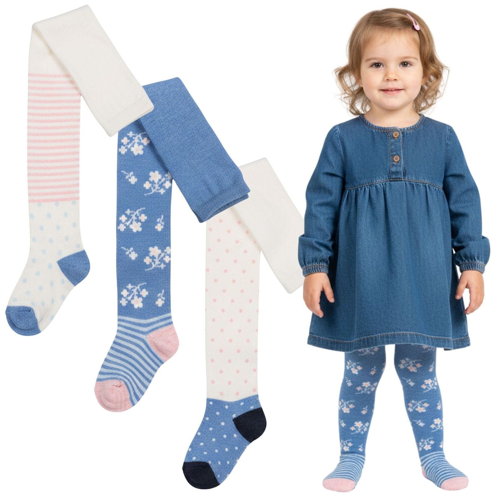 Komplet vsebuje nogavice z nežnimi črtami s pikami, model s cvetličnim vzorcem in klasične pike – vse v harmonični barvni shemi bele, rožnate in modre barve.