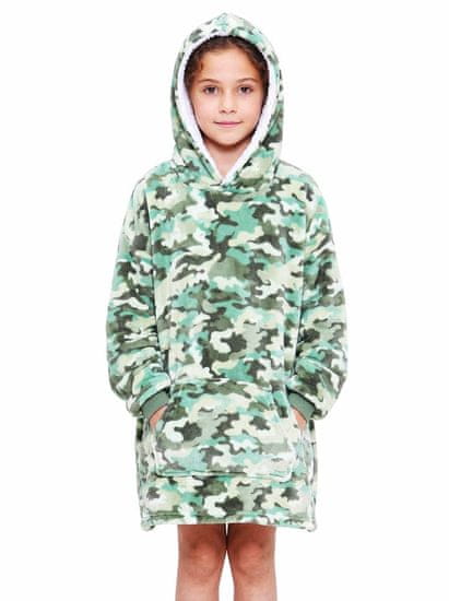Nikcorp Otroška odeja s kapuco 2v1, pulover oversize iz flisa, toplo domače oblačilo, mehak flanela flis, zelena kamuflaža