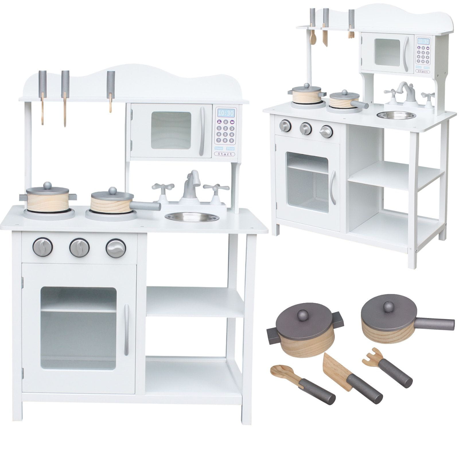 Štedilniki so opremljeni z dvema gorilnikoma s senzorskimi gumbi, na katere lahko postavite priložene lonce in ponve (s pokrovi). Igrače so narejene iz lesa.