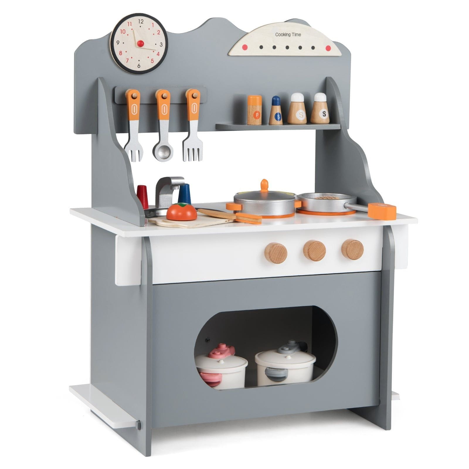 Northix Otroška lesena igralna kuhinja z dvojnim štedilnikom, 12 dodatki, siva, MDF, masiven les