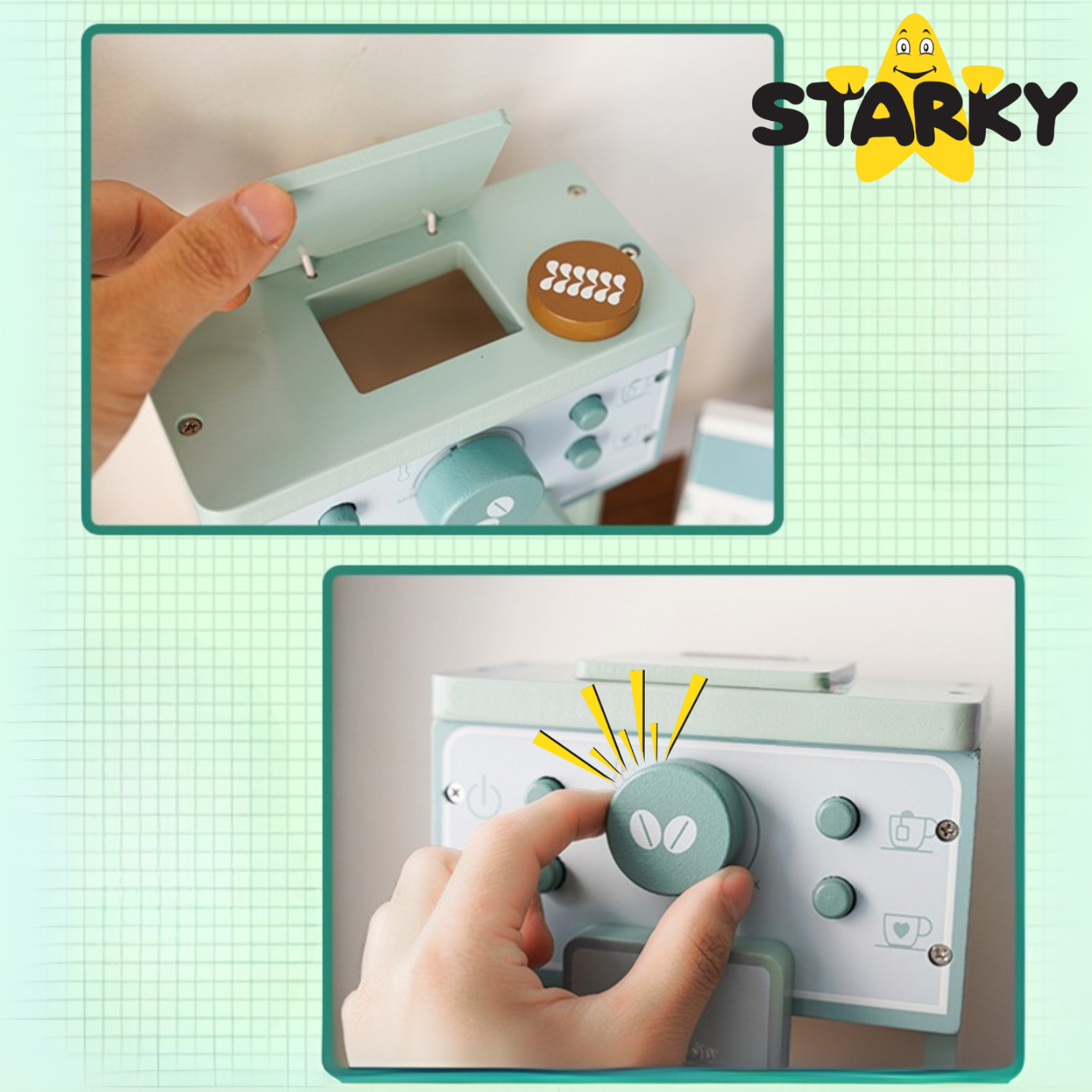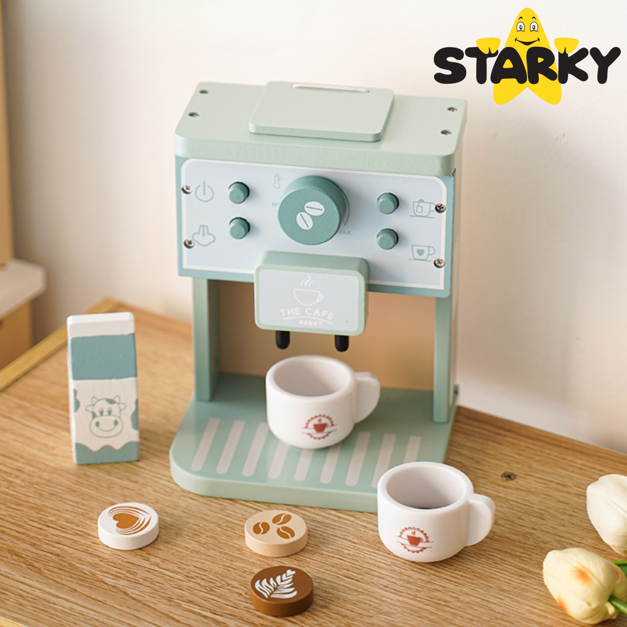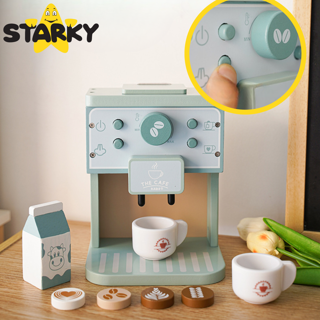 ☑️ Ali si vaš otrok želi postati barista? Ta lesen aparat za kavo je uresničitev sanj za male ljubitelje kave ! Eleganten, varen in v pastelnih barvah – se odlično poda v vsako otroško kuhinjo. Ima premični gumb , ki ob vrtenju oddaja zadovoljiv zvok „klik“.