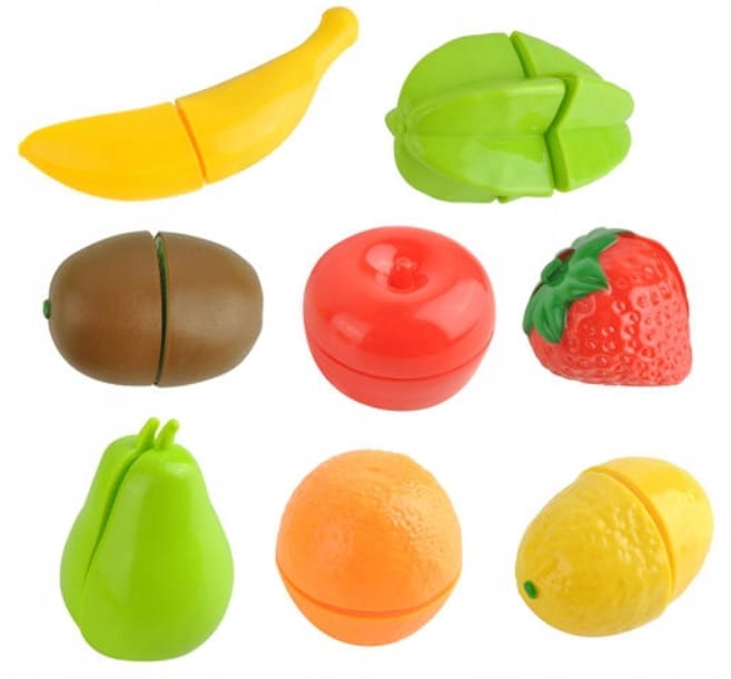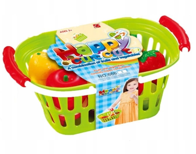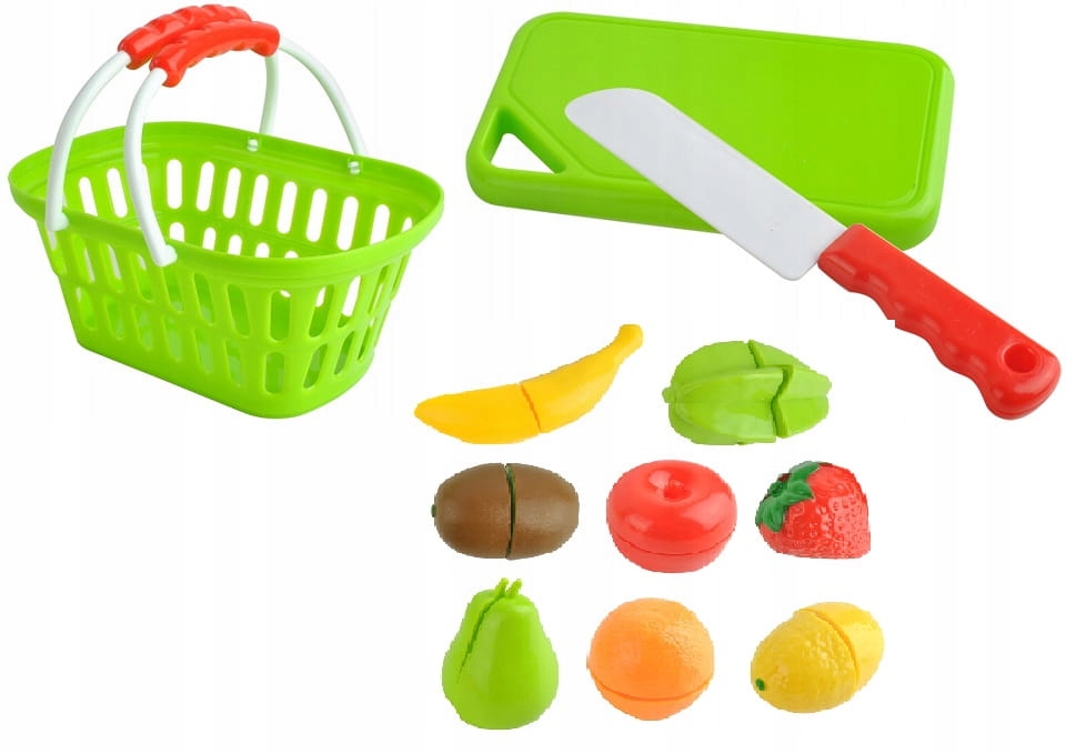 To je odličen začetni komplet ali dodatna oprema za igračo kuhinjo ali trgovino. Košara vsebuje potreben namizni pribor in jedilni pribor za pripravo in uživanje obrokov. Vsaka zelenjava in sadje je zasnovano tako, da ga je mogoče enostavno rezati s priloženim nožem. To je odličen način za pripravo na pravo pripravo hrane. Komplet vsebuje 11 predmetov: