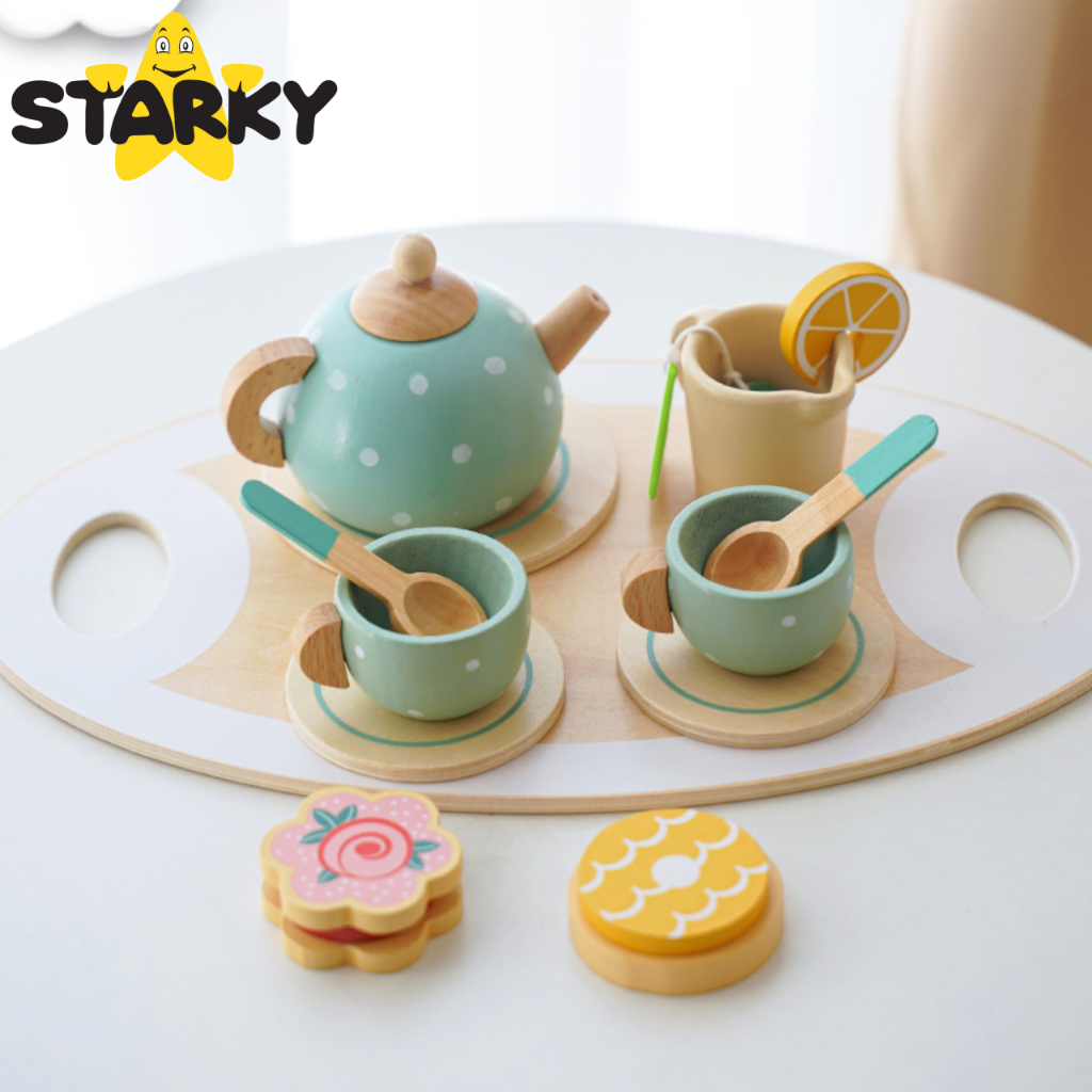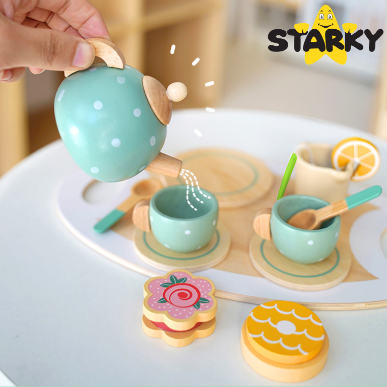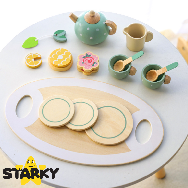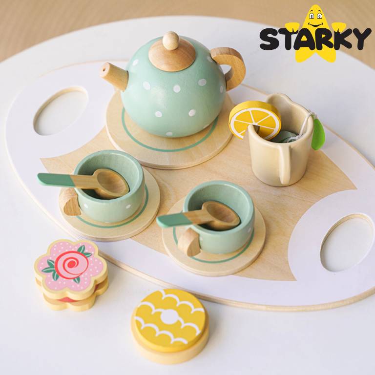 ☑️ Klasika, eleganca in ščepec šarma – to je leseni čajni servis STARKY! Ali je kaj bolj prijetnega kot popoldanski čaj z medvedki in punčkami? Ta bogat komplet je vse, kar potrebujete za organizacijo čarobne čajanke – za otroke, starše in goste plišaste igrače! Čudovite pastelne barve, solidna izdelava in obilo dodatkov bodo vsako zabavo naredili še bolj prijetno!