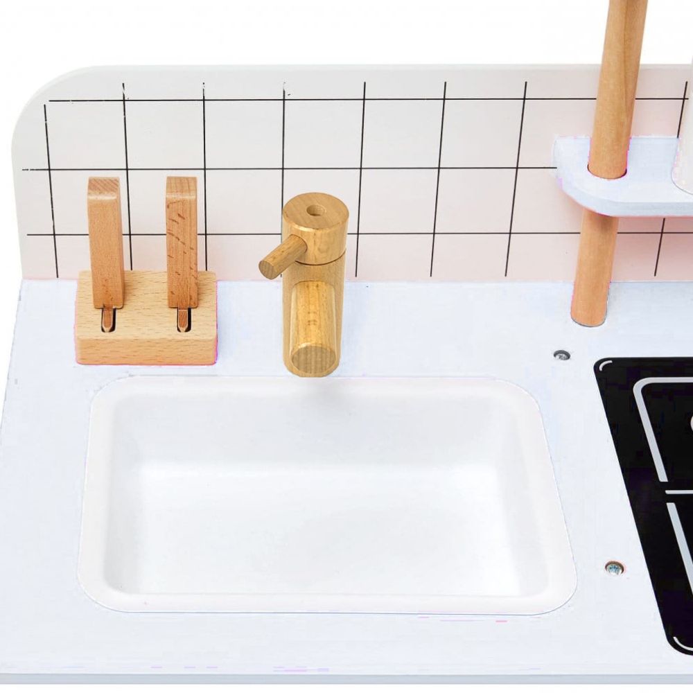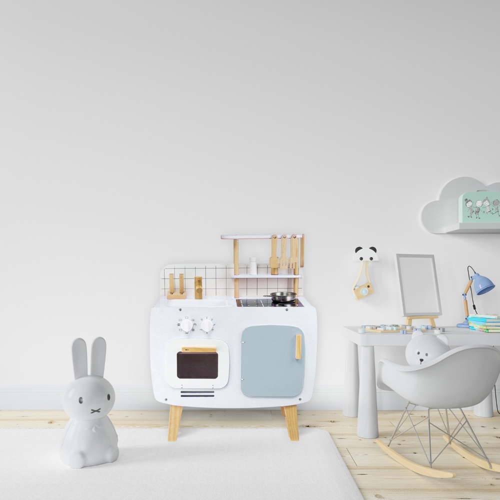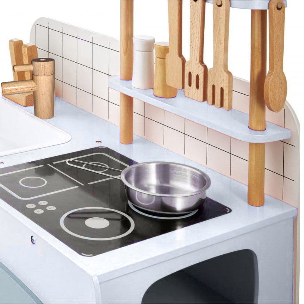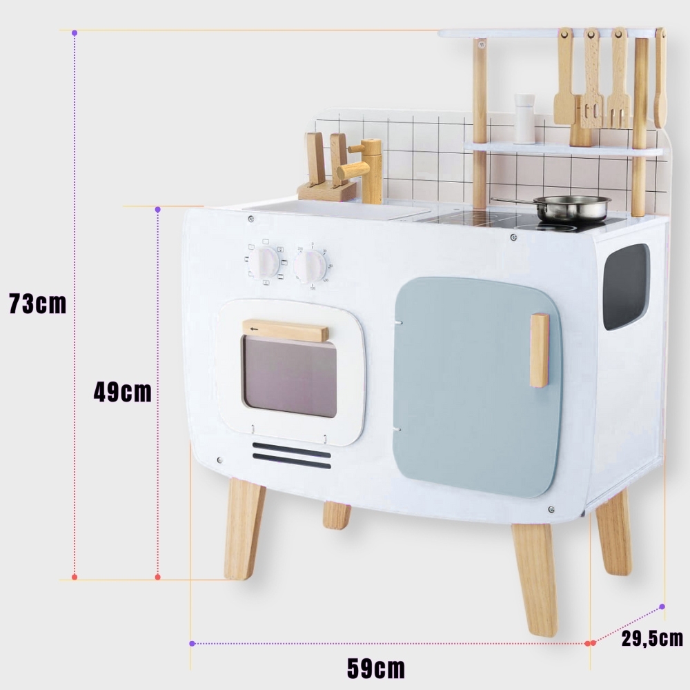 Elegantna oblika, pastelne barve in skrbna izdelava – ta kuhinja je popolna za bodoče kuharske mojstre! Zahvaljujoč leseni konstrukciji se bo podala ne le v otroško sobo, temveč tudi v dnevno sobo in bo vsaki notranjosti dodala čar.