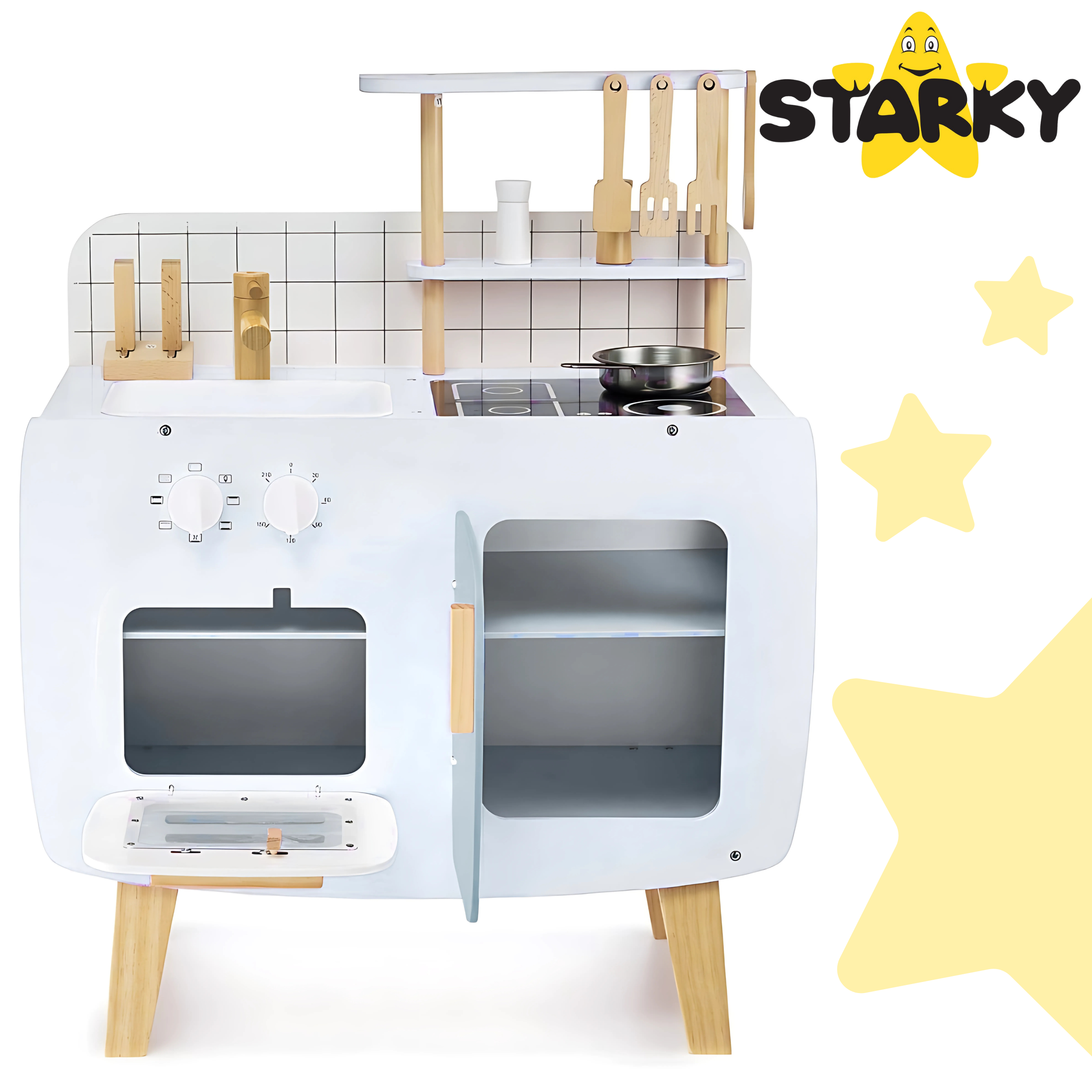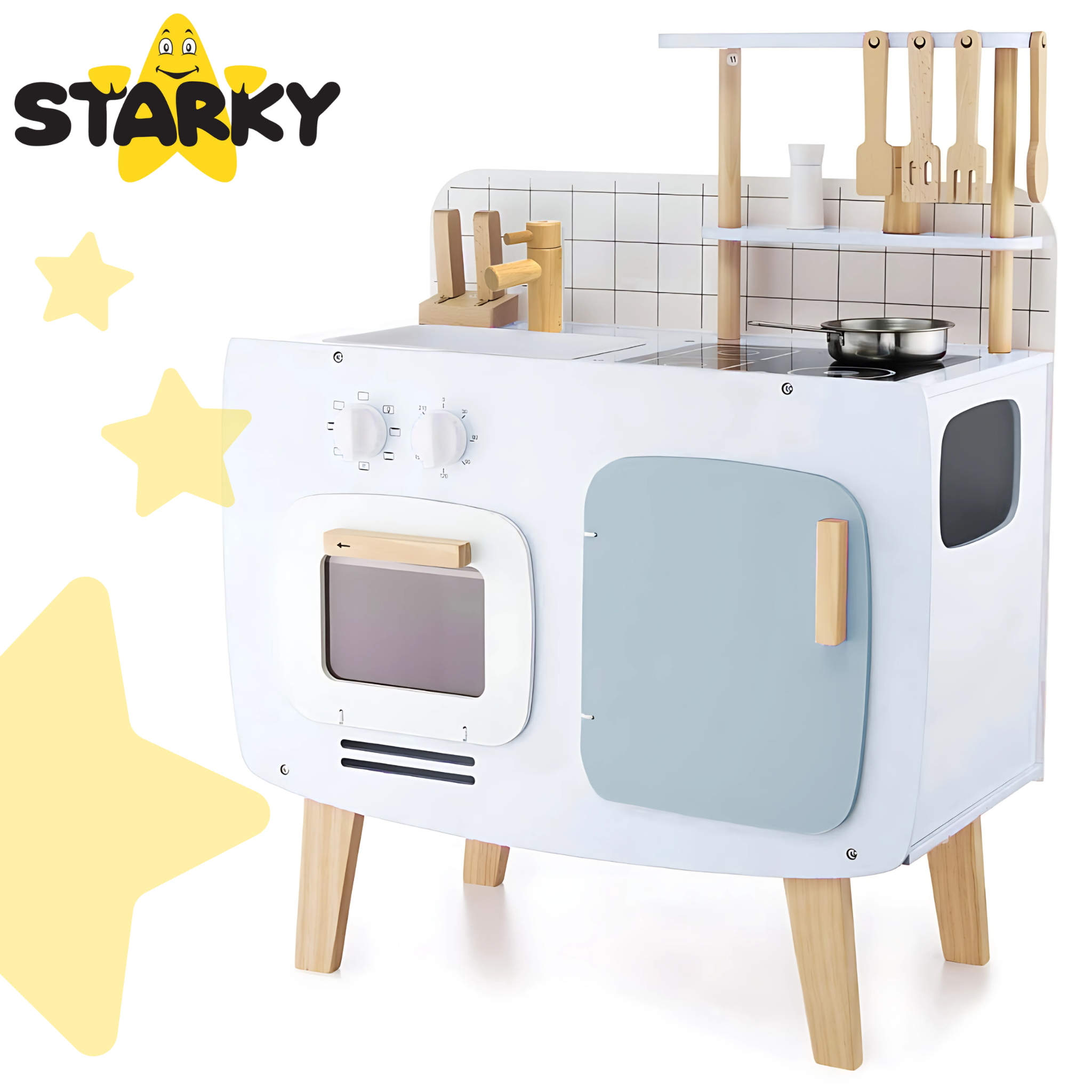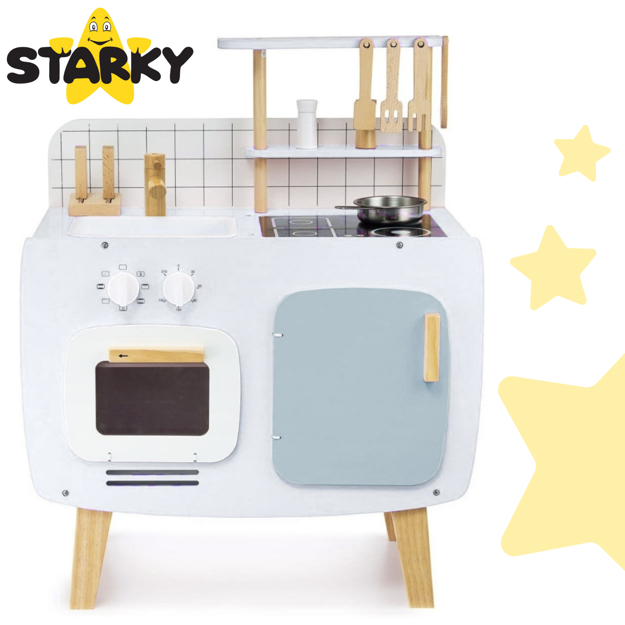 Elegantna oblika, pastelne barve in skrbna izdelava – ta kuhinja je popolna za bodoče kuharske mojstre! Zahvaljujoč leseni konstrukciji se bo podala ne le v otroško sobo, temveč tudi v dnevno sobo in bo vsaki notranjosti dodala čar.