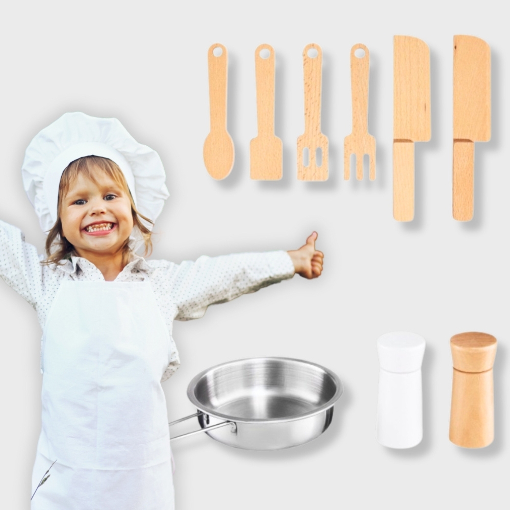 Komplet vključuje tudi dodatne dodatke za kuharja: lonec, 2 noža z lesenim etuijem, zajemalko, 3 lopatice, sol, poper. Zahvaljujoč njim lahko vaš otrok kuha okusne obroke za punčke ali starše.