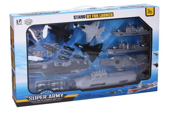 Letalonosilka s katapultom 25 cm s podmornico. Vsebina paketa – letalonosilka na vztrajniku z bojnim katapultom 25 cm, podmornica z izstrelitvijo torpeda 28 cm na vztrajniku, letalonosilka 18 cm, bojna ladja 16 cm, bojna križarka 14 cm, 3× bojni prosti tek 12 cm, 3× bojni katapult 7 cm, 12× torpedo za podmornico. Katapult – vstavite lovca v vzmet pred letalonosilko, katapultirajte ga z gumbom na stolpu. Torpedo – obrnite vrata na vrhu podmornice – vstavite torpedo (največ 3), odstranite sprednji pokrovček podmornice, potegnite in sprostite repno krmilo podmornice, da izstrelite torpedo. Slikovna navodila na embalaži.