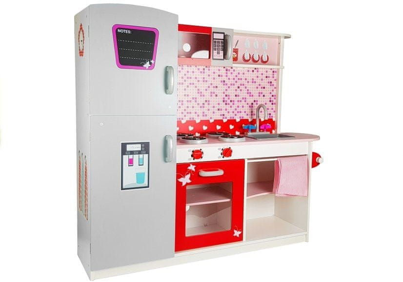 Lesena kuhinja za sestavo z mikrovalovno pečico, hladilnikom in plinskim štedilnikom je edinstven prostor za igro in učenje,