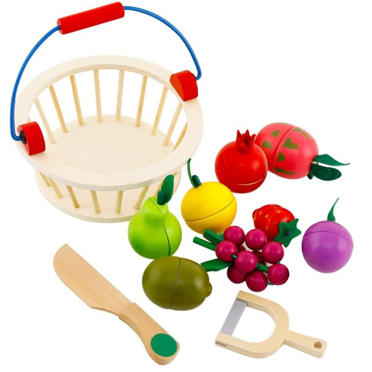 Komplet vsebuje različne vrste sadja in nož za rezanje sadja. Z lesenim nožem in magnetom v plodovih, lahko predmete razpolovite ter kasneje zopet združite. Sadje je pospravljena v priročno leseno košarico. Dimenzije košarice s sadjem so: 18 × 18 × 9cm. Celoten opis