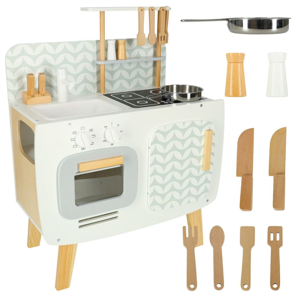 Ta lesena kuhinja za otroke je miniaturna različica prave kuhinje, popolnoma prilagojena malim kuharjem in ljubiteljem hrane. Izdelana je iz trpežnih lesenih materialov, zato bo zagotovo vzdržala številne kuharske seanse!