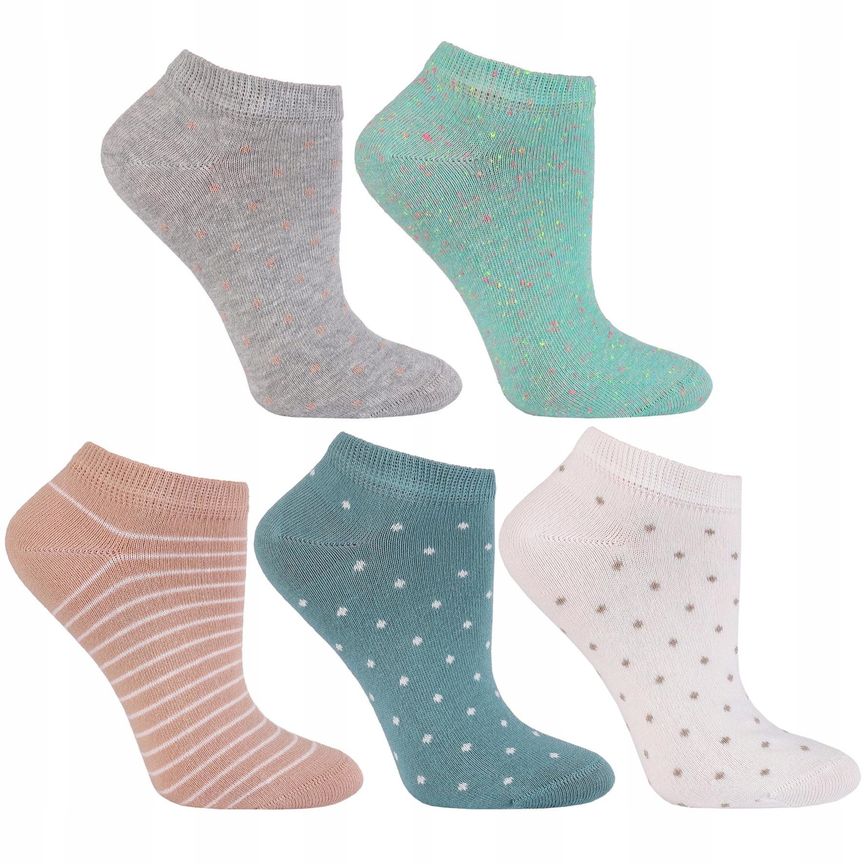 Komplet ženskih bombažnih nogavic do gležnjev. Ta paket 5 kosov je popolna rešitev za ženske, ki cenijo udobje, kakovost in zabaven stil. Nogavice so izdelane iz visokokakovostnih bombažnih mešanic, kar zagotavlja mehkobo, zračnost in vzdržljivost.
