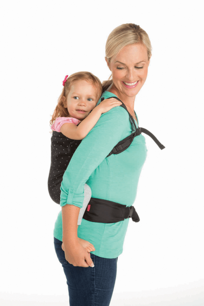 Podporni ledveni pas pomaga razporediti težo otroka na starševske boke. Naramnice so oblazinjene za udobje.