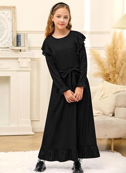 BesserBay predstavlja črno maksi obleko z dolgimi rokavi, ki združuje udobje in brezčasno eleganco za deklice v starosti od 13 do 14 let. Oblačilo je zasnovano za vsakodnevno nošenje in posebne priložnosti, kjer je poudarek na prijetnem občutku med gibanjem. Izdelana je iz mehkega materiala, ki je primeren za hladnejše jesenske dni, saj zagotavlja potrebno toplino. Diskretni stranski žepi in prilagodljiv pas v taliji omogočajo praktično uporabo in prilagajanje postavi, medtem ko volančki dodajo igriv značaj celotnemu dizajnu.