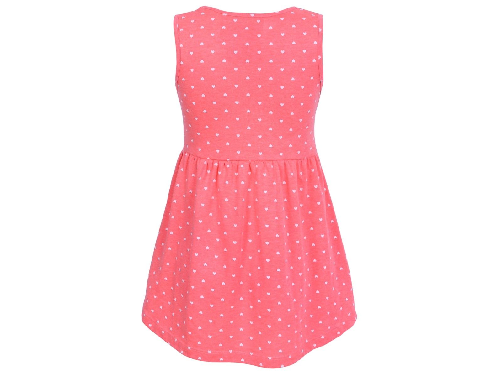 Pomarančno-neonska, razširjena obleka z ponavljajočim se motivom srčkov, na širokih naramnicah.Obleka se oblači čez glavo, v pasu zareza in rahlo nabiranje.Izdelana iz mehkega, prijetnega na dotik materiala.Sestava: 66% poliester, 34% bombaž. Velikost 1,5–2 leti / 92 cmSkupna dolžina: 44 cmŠirina po Celoten opis