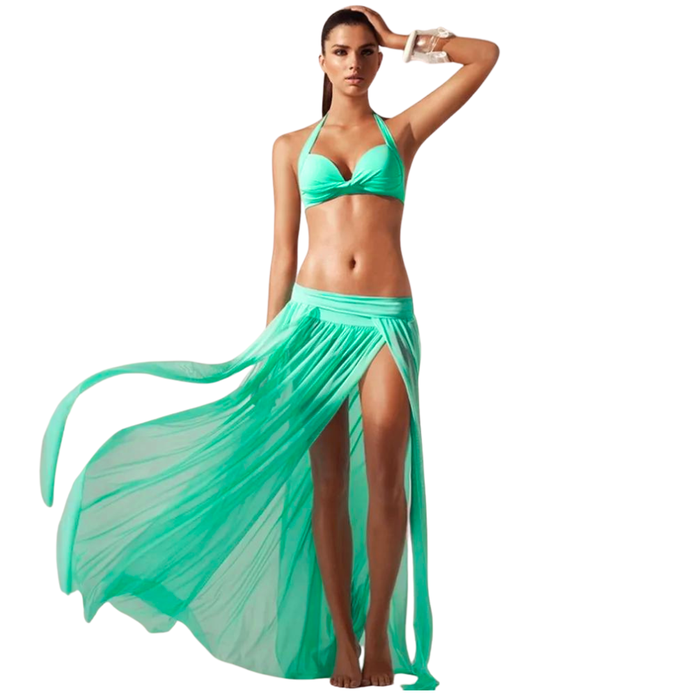 To dolgo krilo, ki je na voljo v čudoviti turkizni barvi, bi moralo biti nepogrešljiv kos oblačila za na plažo za vsako žensko. Seksi kroj z globoko režo, ki razkriva noge, in zračen, prosojen material bosta nedvomno pritegnila pozornost. ❤️‍