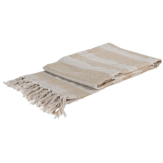 • toplo bombažno pregrinjalo za posteljo HOMESTYLING- lepo pregrinjalo za posteljo bo zagotovo naredilo prijetno vsako spalnico in dnevno sobo- to pregrinjalo lahko uporabite za prekrivanje odeje v spalnici- enako dobro se obnese kot udobna odeja za crkljanje- izdelano je iz 100 % bombaža- odeja ima na dveh straneh čopke- skupne mere: 130 × 170 cm- barva: bež črte- znamka: HOMESTYLING