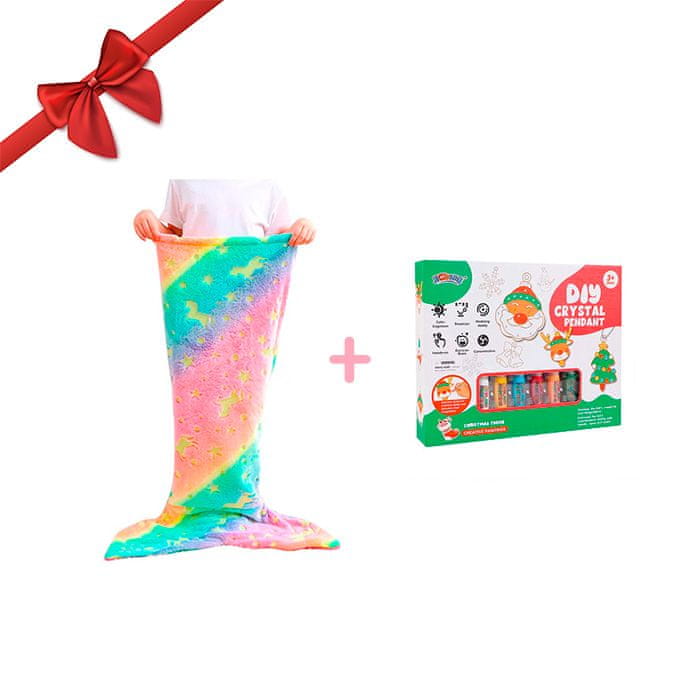 Paket MermaidArtCraft vključuje kar 2 igrači – dekliško odejo v obliki repa morske deklice in božični set za ustvarjanje obeskov!
