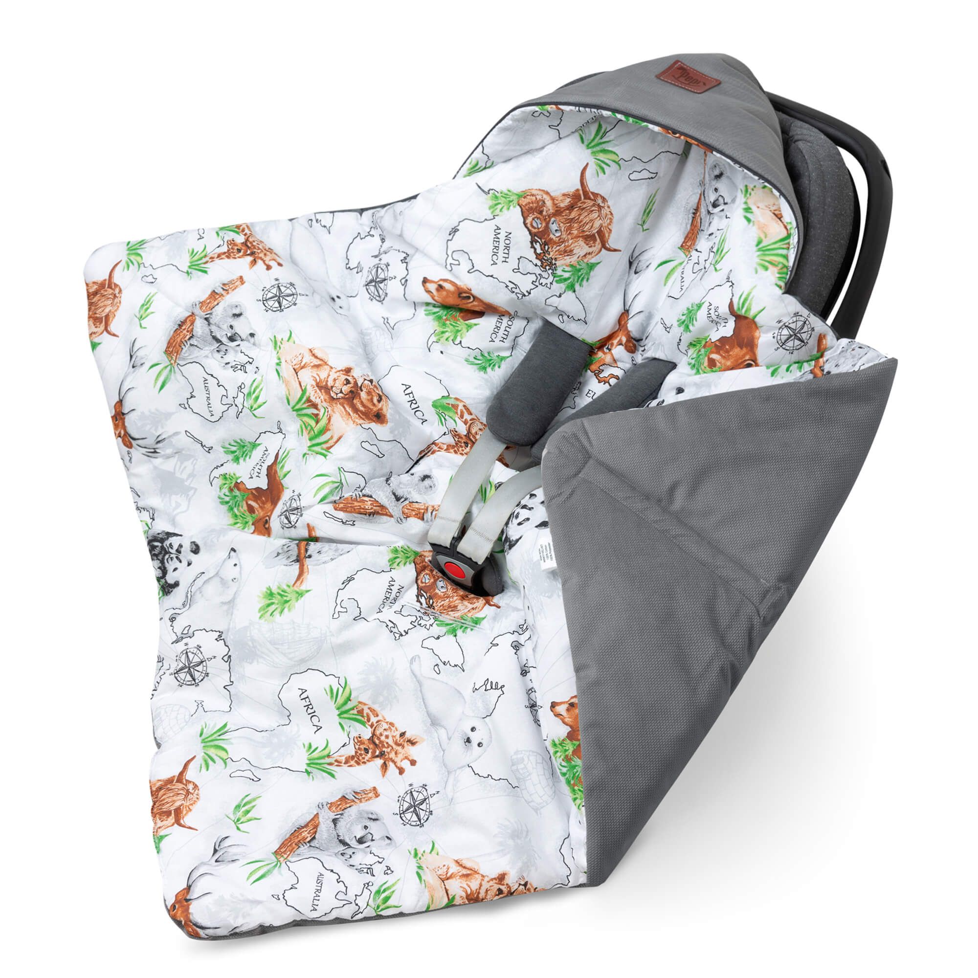 Velikost odeje in razporeditev lukenj za pasove v ovitku sta univerzalna, zato je primerna za večino avtomobilskih sedežev, vozičkov ali nosilcev. Zaradi trakov odeja ostane na mestu, ne da bi se bali, da bi zdrsnila s sedeža. Kapuca odeje je okrašena z barvno obrobo, ki dodatno utrdi kapuco nad otrokovim obrazom. Ovijalka se zapenja s priročnim zapenjanjem z velcro, ki omogoča poljubno prilagajanje.