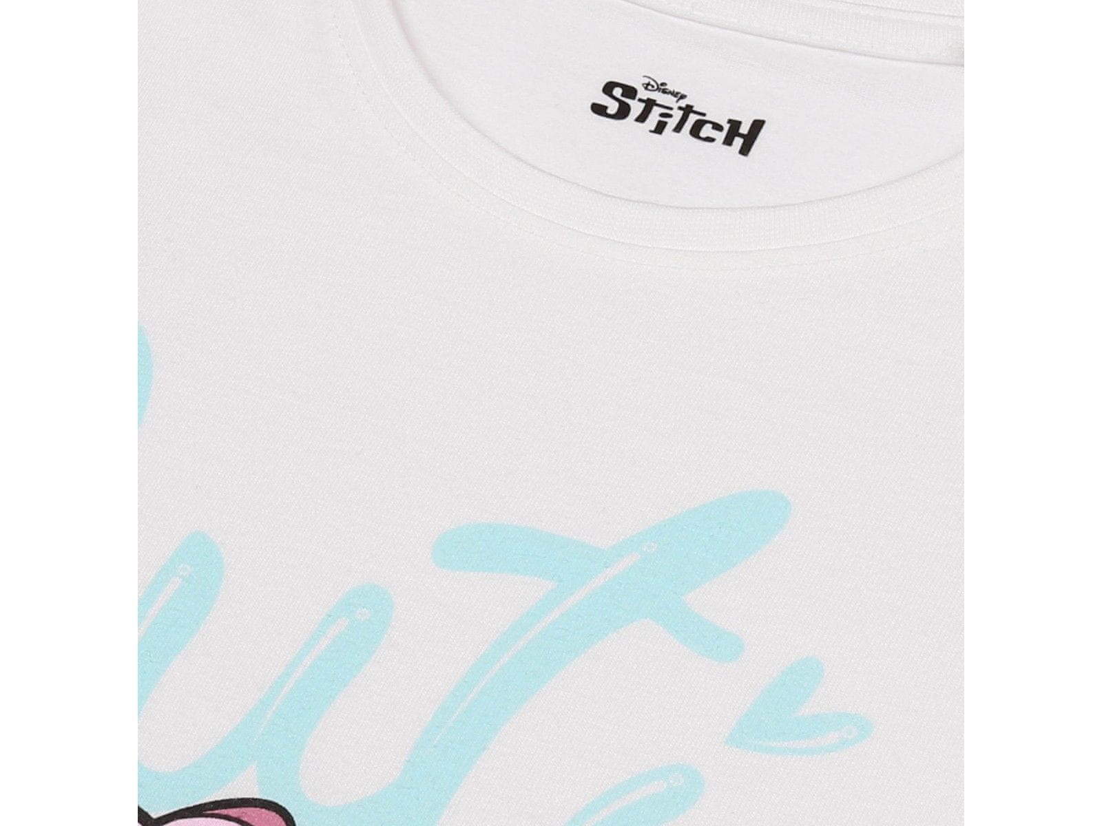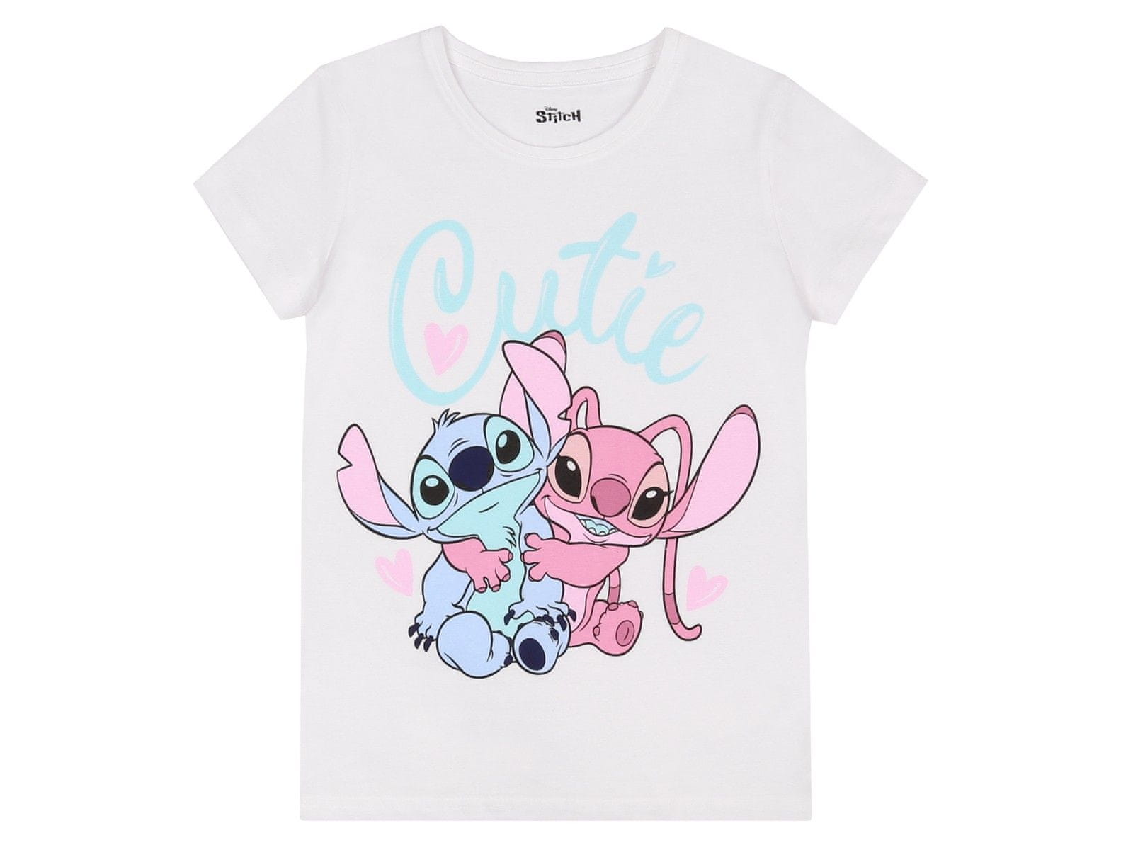 Majica v beli barvi z velikim potiskom Stitch in Angel, ki se objemata, ter besedo „Cutie“ v pastelnih barvah poskrbi za pravljično razpoloženje.
