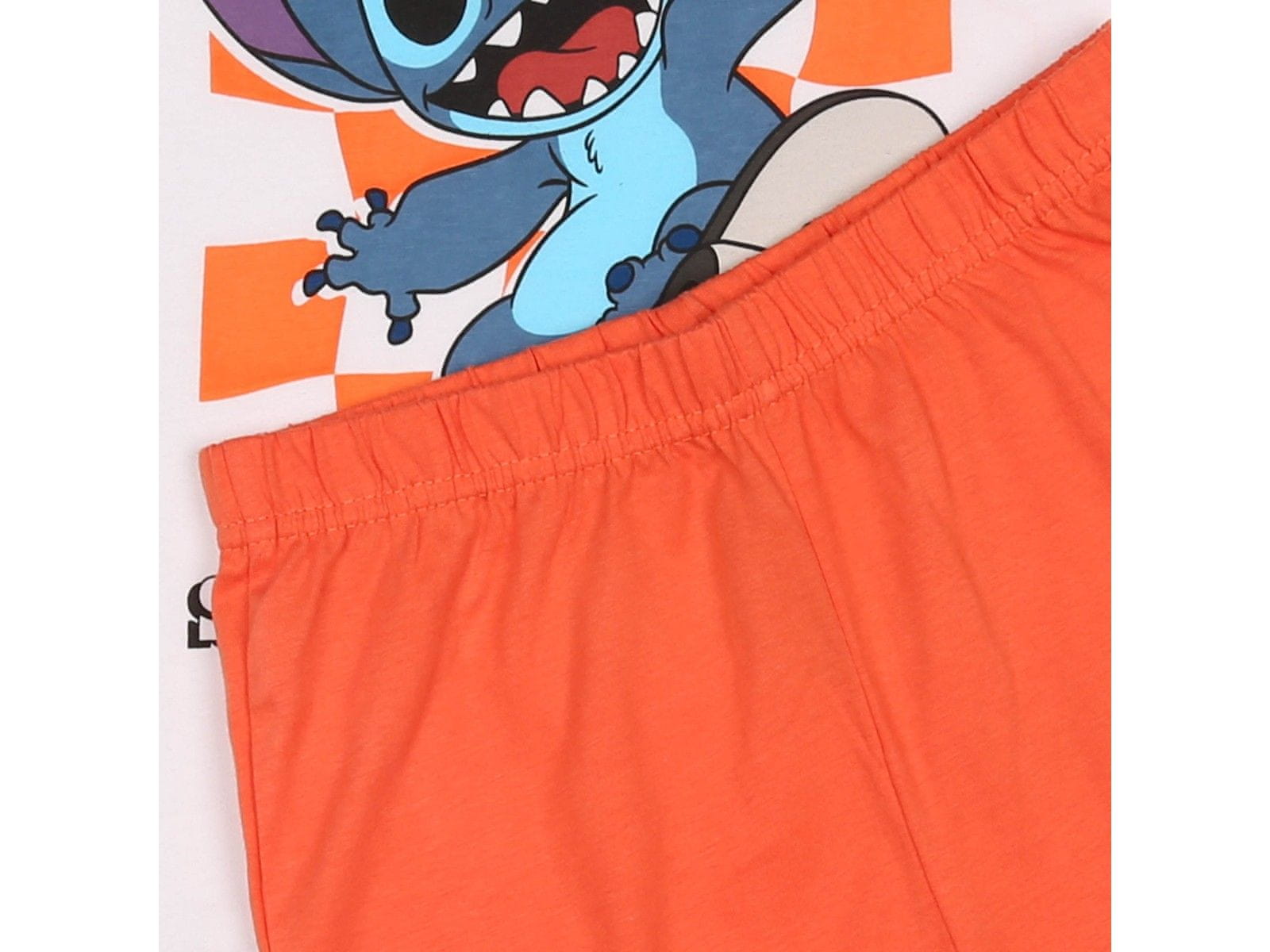 Sestavljajo ga bela majica z barvitim potiskom, na katerem je upodobljen Stitch na rolki, in oranžne kratke hlače z dodatno grafiko.