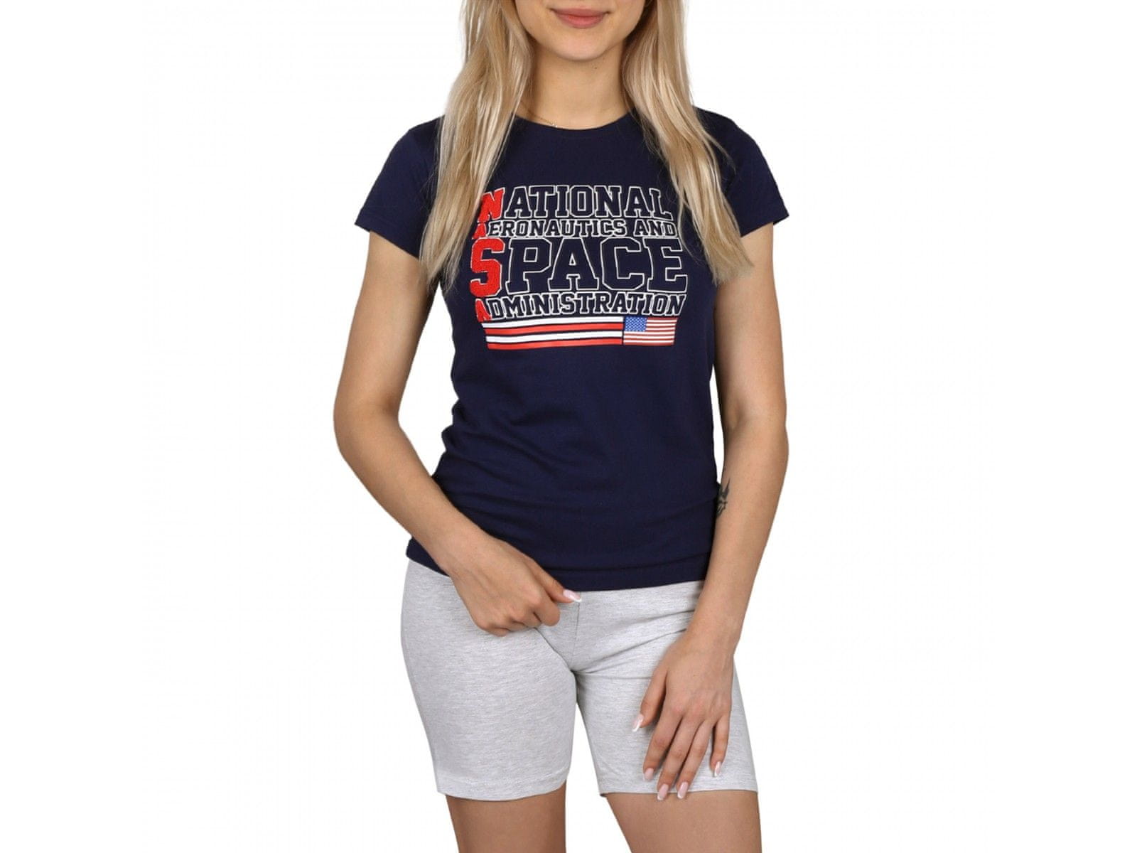 Temno modro-siva, dekliška, kratka dvodelna pižama z napisi in znakom NASA. Kratke hlače z nepritiskajočim elastičnim pasom, majica preprostega in klasičnega kroja s kratkimi rokavi. Komplet je izdelan iz mehkega, prijetnega na otip materiala, v katerem koža prosto diha. Pižama je idealna za počitek Celoten opis