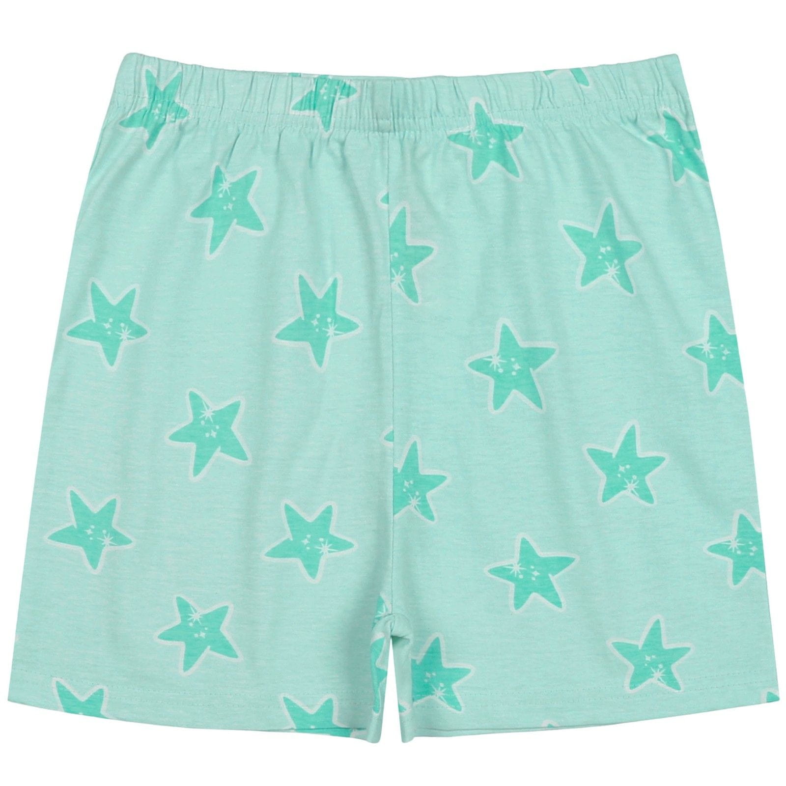 Komplet sestavljata kratka majica s pisanim potiskom in kratke hlače z zvezdicami za udobje in svobodo gibanja med spanjem.