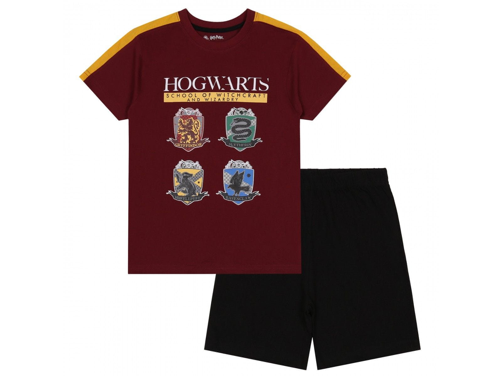 Bordo-črna, fantovska dvodelna pižama z natisnjenimi simboli Domov čarovništva in magije v Bradavičarki. Kratke hlače z udobnim pasom brez pritiska, majica s preprostim in klasičnim krojem s kratkimi rokavi. Komplet je izdelan iz mehkega, na otip prijetnega materiala, ki omogoča koži, da prosto diha Celoten opis