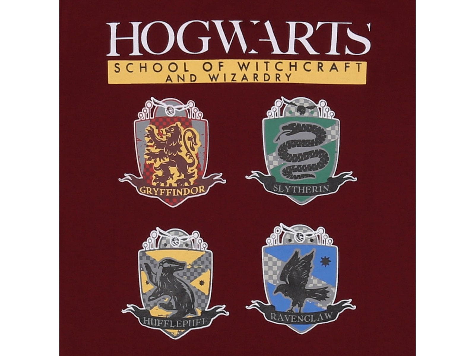 Bordo-črna, fantovska dvodelna pižama z natisnjenimi simboli Domov čarovništva in magije v Hogwarts.