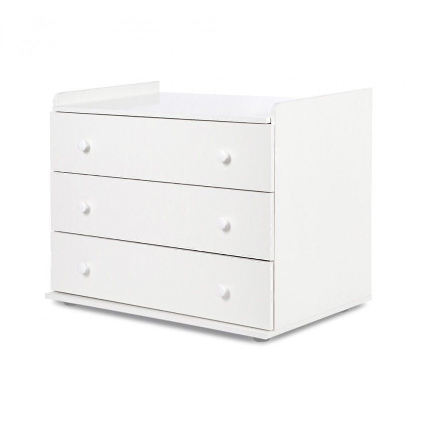 Posteljica za dojenčka: na začetku nudi varno in udobno okolje za najmlajše, s čimer zagotavlja optimalen spanec. Integrirana previjalna miza: vključena previjalna miza omogoča enostavno in varno menjavo plenic, hkrati pa prispeva k urejenosti otroške sobe. Preoblikovanje previjalne mize v komodo: ko otrok zraste, lahko starši odstranijo previjalno mizo in jo uporabijo kot samostojno komodo. Postelja „raste“ skupaj z otrokom: z odstranitvijo previjalne mize se postelja prilagodi potrebam starejšega otroka.
