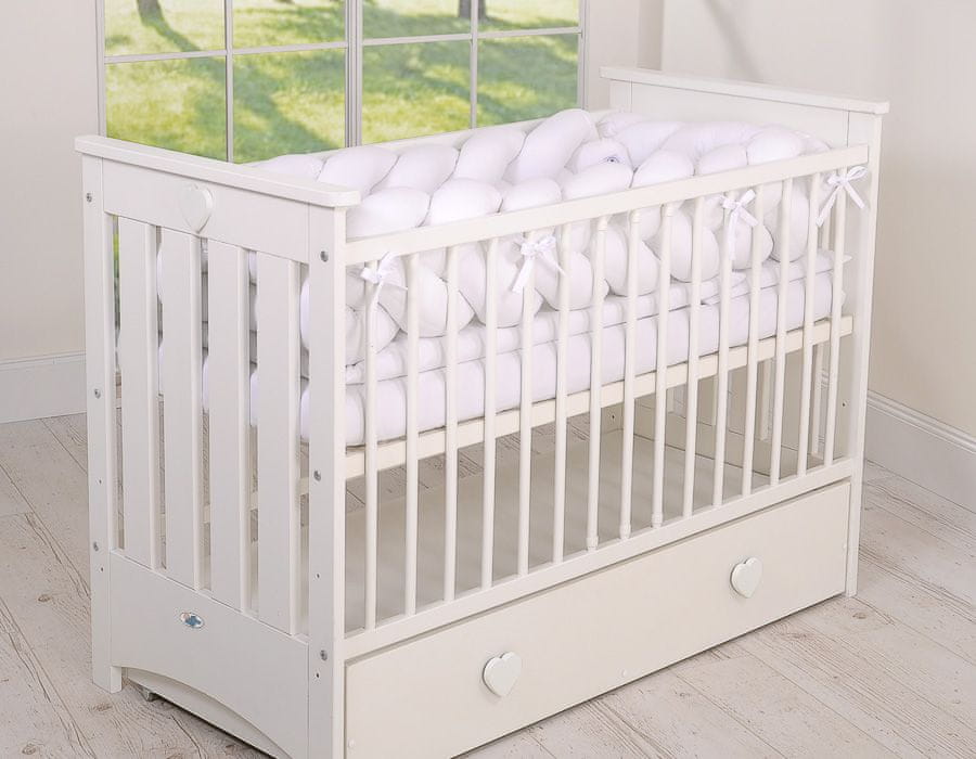 Bele lesene jaslice iz debelega, masivnega lesa. Bele okrasne letve na sprednjih stranicah posteljice in belo srce na sprednji strani posteljice ustvarjajo nežen, bel okrasni poudarek. Lesena otroška posteljica – ustreza veljavnemu standardu PN-EN 716–1:2017.