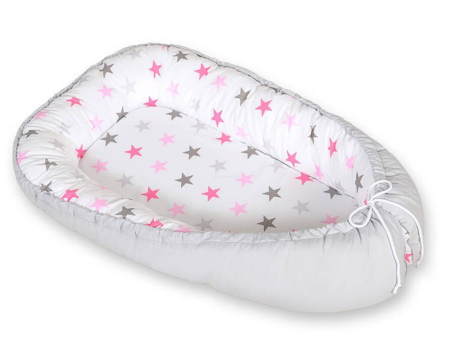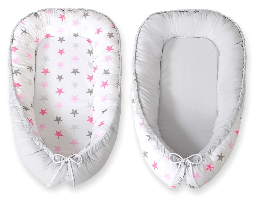 shumee Otroški kokon, obojestranski, stajica, previjanje, Premium BOBONO - roza-sivo/sive zvezdice