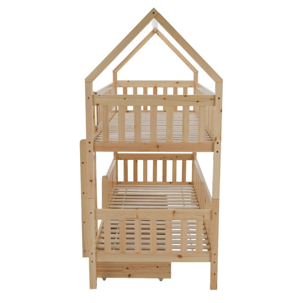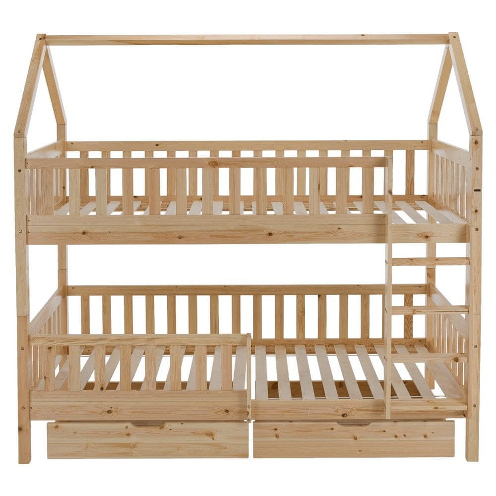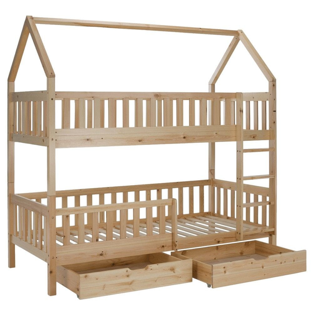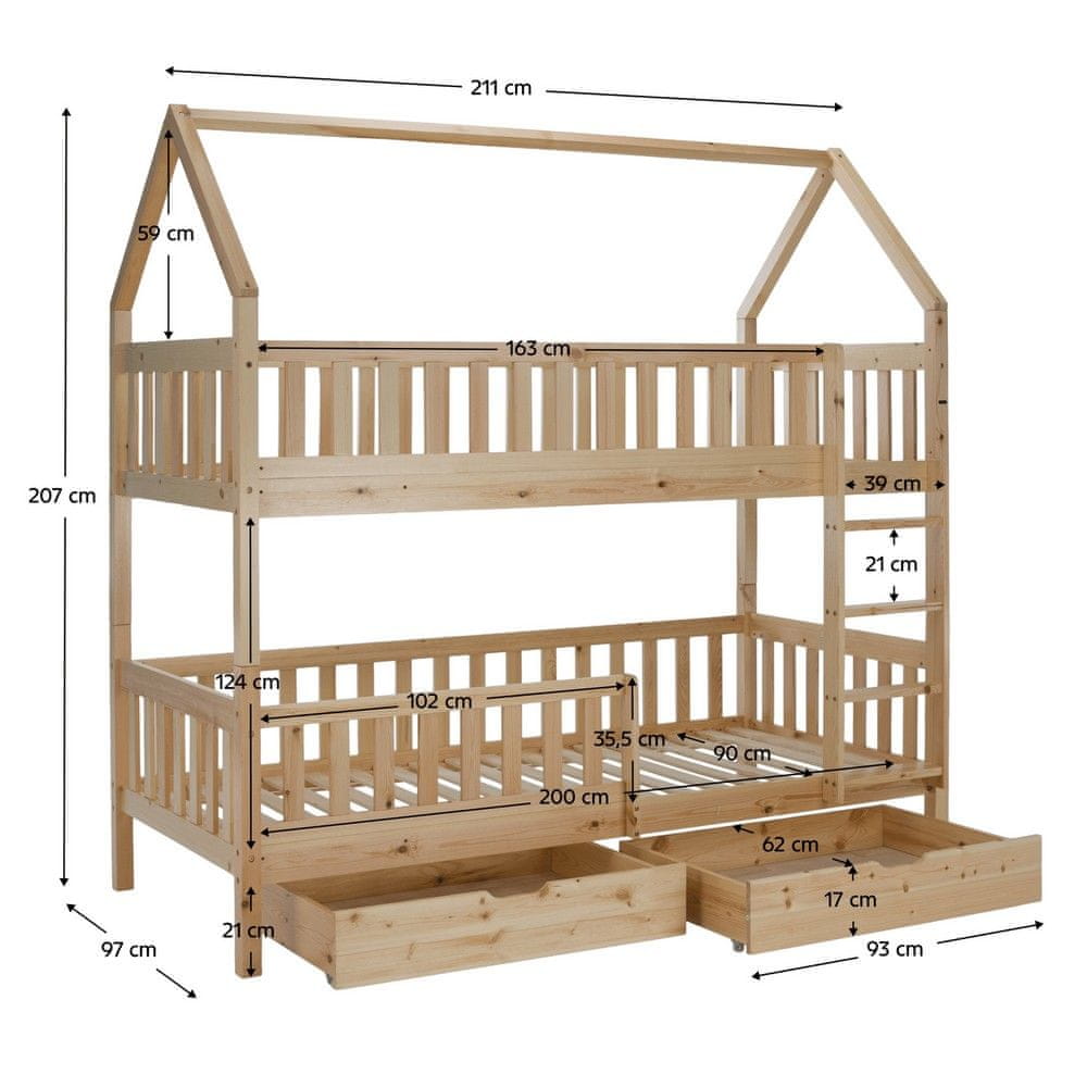 Montessori je vzgojna filozofija, ki temelji na spoštovanju potreb otroka, njegove individualnosti in naravnega razvoja. Okolje, v katerem otrok preživlja čas, bi moralo spodbujati njegovo samostojnost, ustvarjalnost in odgovornost. Idealen prostor za uveljavljanje teh načel je otroška soba – in še posebej postelja, ki združuje počitek, varnost in možnost svobodnega gibanja. Pograd Venita Tip 2 v obliki hiške je praktičen in hkrati igriv dodatek za vsako otroško sobo. Izdelana je iz masivnega borovega lesa in vezane plošče, površina je obdelana z ekološkimi in pralnimi barvami v naravni barvi. Zaradi preprostega dizajna in čistih linij se prilega vsakemu slogu notranjosti. Postelja ponuja dve ležišči z dimenzijami 90×200 cm in dva prostorna predala na kolesih, ki sta idealna za igrače, knjige ali posteljnino. Obe ležišči sta opremljeni z zaščitnimi pregradami, ki povečujejo varnost med spanjem. Lestev je mogoče namestiti na desno ali levo stran, glede na potrebe. Višina med ležiščema je 124 cm, višina nogic 21 cm. Skupne dimenzije postelje so (ŠxGxV): 211×97×207 cm. Prednost je tudi možnost razstavitve na dve ločeni postelji, kar podaljša njeno uporabnost. Nosilnost zgornjega ležišča je 90 kg, spodnjega 95 kg. Postelja se dobavlja z lameliranimi zvitimi letvicami iz vezane plošče brez vzmetnic. Priporočena višina vzmetnice je do 14 cm za zgornje ležišče in do 18 cm za spodnje. Dostavljen je razstavljen. Priporočilo za vzdrževanje: čistite z vlažno krpo, uporabljajte nevtralno milo in ne izpostavljajte neposredni sončni svetlobi. Venita Tip 2 je idealna rešitev za otroško sobo, ki združuje varnost, praktičnost in čaroben videz, ki spodbuja otroško domišljijo in samostojnost.
