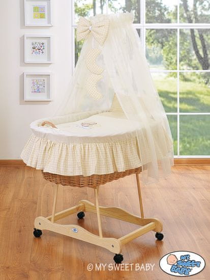Krasna, velika ročno pletena pletena košara z originalnim lesenim podvozjem. Naravna barva protja in lesa. .Pletena košara za spanje za dojenčke priznanega podjetja , vodilnega evropskega proizvajalca takšnih košar. Vrhunska kakovost, tkanine s certifikatom Okotex in TUV. Izvrstna rešitev tako za majhna stanovanja kot za hiše. Zaradi okretnih vrtljivih kolesc lahko košaro enostavno premikate. S tem boste zagotovili, da bo vaš otrok vedno z vami. Lahko tudi udobno spi na balkonu ali na vrtu – v košari je namreč veliko več prostora kot v prenosni košarici otroškega vozička. Skupne mere: D 95 cm, B 65 cm, V 140 cm. Meritve ležišča: 80×45 cm. Vključuje: – pletena košara, – podvozje s 4 plastičnimi vrtljivimi kolesi , – 100 % bombažna prevleka za košare, .br /> – šifonska krošnja+ lok+obesne aplikacije, – okvir krošnje, – komplet polnil: vzglavnik (35×37 cm) in prevleka za odejo (78×78 cm), – prevleka za vzglavnik (35×37 cm) in prevleka za odejo z vezenjem (78×78 cm), - vzmetnica PREMIUM (pribl. debeline 4 cm)- izdelana iz debele stisnjene netkane tkanine, ki je vzmetna, antialergijska in diha. Z lahkim prešitim pokrivalom, ki ga je mogoče enostavno odstraniti za pranje, zapenja se s pokrito zadrgo; pozitivnemu laboratorijskemu testiranju .TÜV Rheinlandza skladnost s standardom PN-EN 1130–1:2001 in PN-EN 1130–2:2001 ter imajo potrdilo o preskusu TÜV. To so edine košare v Evropi, ki so prestale takšne preskuse in zagotavljajo najvišjo raven varnosti.