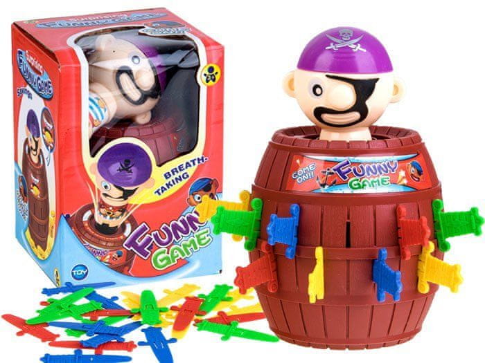 CRAZY PIRATE SKIL GAME Fantastična igra za vso družino, ki bo zagotovo prinesla veliko veselja in zabave. Pozitivno vpliva na razvoj logičnega mišljenja. Med igro se otrok uči zdrave tekmovalnosti in učinkovite komunikacije. Popoln način za brezplačno preživljanje časa z najdražjimi. Pravila igre: Pirata postavite v sod z glavo, ki štrli ven. Večkrat se obrnite. Vsakemu igralcu dajte meče. Vsakdo izmenično vstavi po en meč v cev. Pazite, da ne zabodete pirata. Ob udarcu z mečem pirat strelja iz cevi kot iz frače. Zmagovalec je tisti, ki prvi vtakne vse svoje meče v cev ali vloži več mečev, preden pirat skoči iz cevi. vso srečo! Set vsebuje: Gusarski sod 16 mečev v 4 različnih barvah Popolna ideja za darilo. Pakirano v estetski kartonski škatli. lepo se imejte! Dimenzije: Cev (premer x višina): 8 cm x 11 cm Gusar: 9,5 cm Meč: 5,5 cm Pakiranje: 11 cm x 11 cm x 15 cm POZOR! Dizajn in barva embalaže se lahko razlikujeta od prikazane fotografije.