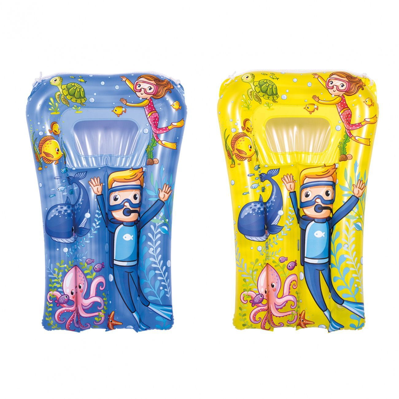 Ime: zračna vzmetnica z oknom za pregledovanje dna. Velikosti: 74 × 48 cm. Nosilnost: 30 kg. Motiv: potapljač v morskih globinah. Sorto – na voljo sta 2 vrsti: modra ali rumena. Starost: od 3 do 6 let. Celoten opis
