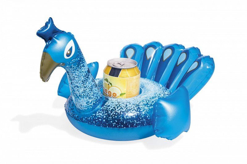 Napihljivo plavajoče držalo za pijačo v dveh privlačnih različicah – flamingo in pav. Idealno za bazen ali masažno kad. Dimenzije flamingo 26,5 × 24 cm, pav 34,5 × 31 cm