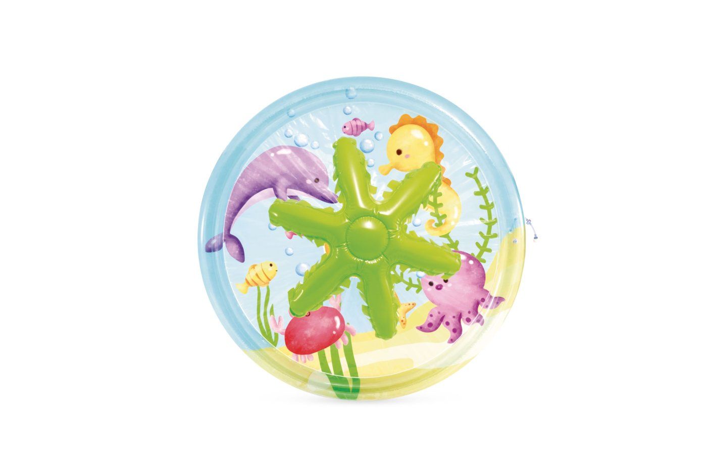 Za priključitev na vrtno cev nežen vodni pršilnik kaplja po obodu bazena in tako zagotavlja osvežitev in veliko zabave. Bazen je idealen za vroče poletne dni. Nizka raven vode zagotavlja večjo varnost med igro. Bazen preprosto napihnite, dodajte vodo in zabava se lahko začne.