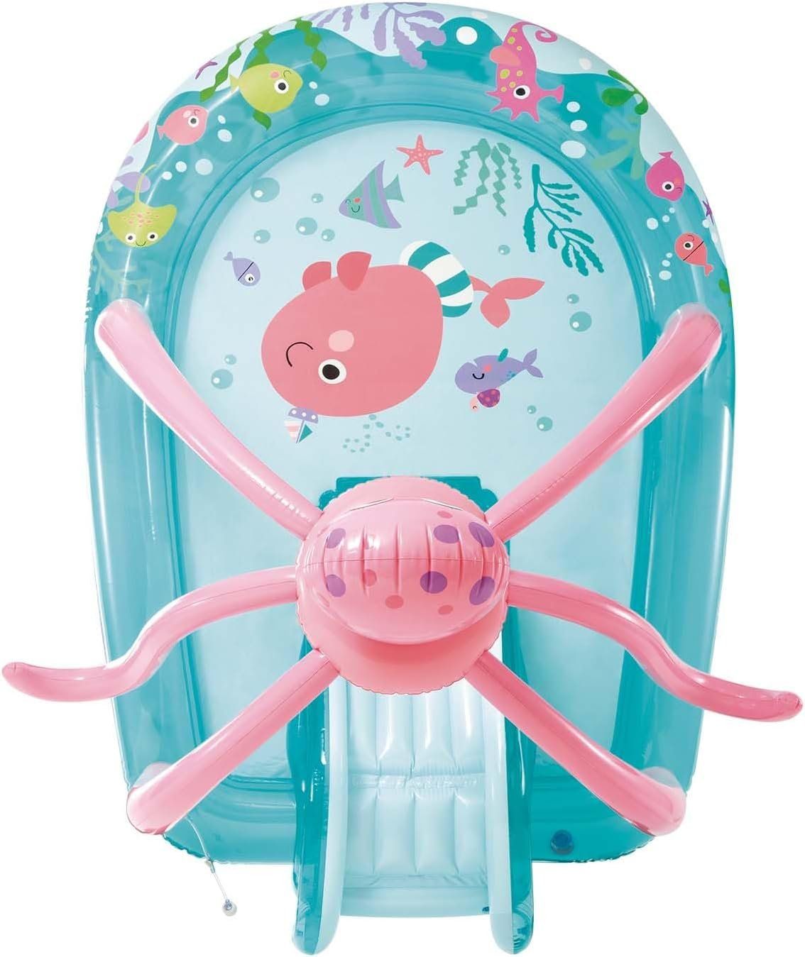 Zaábombažnoé napihljivoí igralnoí središče z motivom srečneé hobotnice. Stabilna konstrukcija igralnega´ centra z bazenom, toboganom in prho, kiá ob priključitvi na vrtno´ cev izstreliá vodo. V paketu sta tudié 2 há obroča, kié ju lahko há namestite na macke hobotnice. Zanesljivý materialá z mehkimiý napihljivimiá stenami zagotavljaá varnost za otroke. Prostornina bazena je 229 l, višina površine pa 14 cm. Napihljive igrače in oprema Intex izpolnjujejo najvišje varnostne standarde za obdelavo in uporabo materialov.