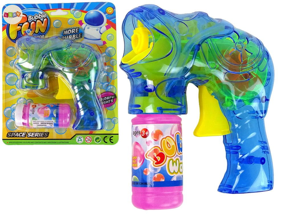 Pištola za milne mehurčke Machine Blue Pištola za mehurčke je igrača, ki jo bo vzljubil vsak otrok, igranje z njo vam omogoča občudovanje mavričnih milnih mehurčkov, ki lebdijo v zraku in se čudovito svetijo v različnih barvah. Naredi jih lahko na desetine! Zasnova predstavljene igrače združuje strukturo, značilno za puške, in spreminja navaden stroj za izdelavo milnih mehurčkov v izvirno, unikatno igračo. Velika prednost so posebni efekti v obliki svetlečega elementa, ki se aktivira ob pritisku na sprožilec. Uporaba igrače je zelo preprosta: samo odvijete pokrovček stekleničke s tekočino, odstranite zaščito in jo privijete v pištolo. Vsakič, ko pritisnete na sprožilec, bodo iz pištole prišli čudoviti pisani milni mehurčki. Ko končate z igro, odvijte stekleničko s tekočino in jo pospravite na varno. Zaradi inovativne formule tekočine je njena sestava varna in nestrupena, mehurčki pa so izjemno obstojni in dolgotrajni. Vendar je vredno spomniti, da občasno očistite pištolo. To storite tako, da odvijete plastenko s tekočino in obrišite britvico z mokro krpo. Ta postopek bo zagotovil, da bo pištola služila otroku dlje časa in mu zagotovila fantastično zabavo. Dimenzije pištole: 14 cm x 13 cm x 5 cm Dimenzije embalaže: 17 cm x 22 cm x 5 cm Igrača pištola za mehurčke je namenjena vsem otrokom starejšim od 3 let. Pištola za mehurčke ima CE certifikat, njena proizvodnja pa je v skladu s standardom EN 71, kar zagotavlja varno uporabo.