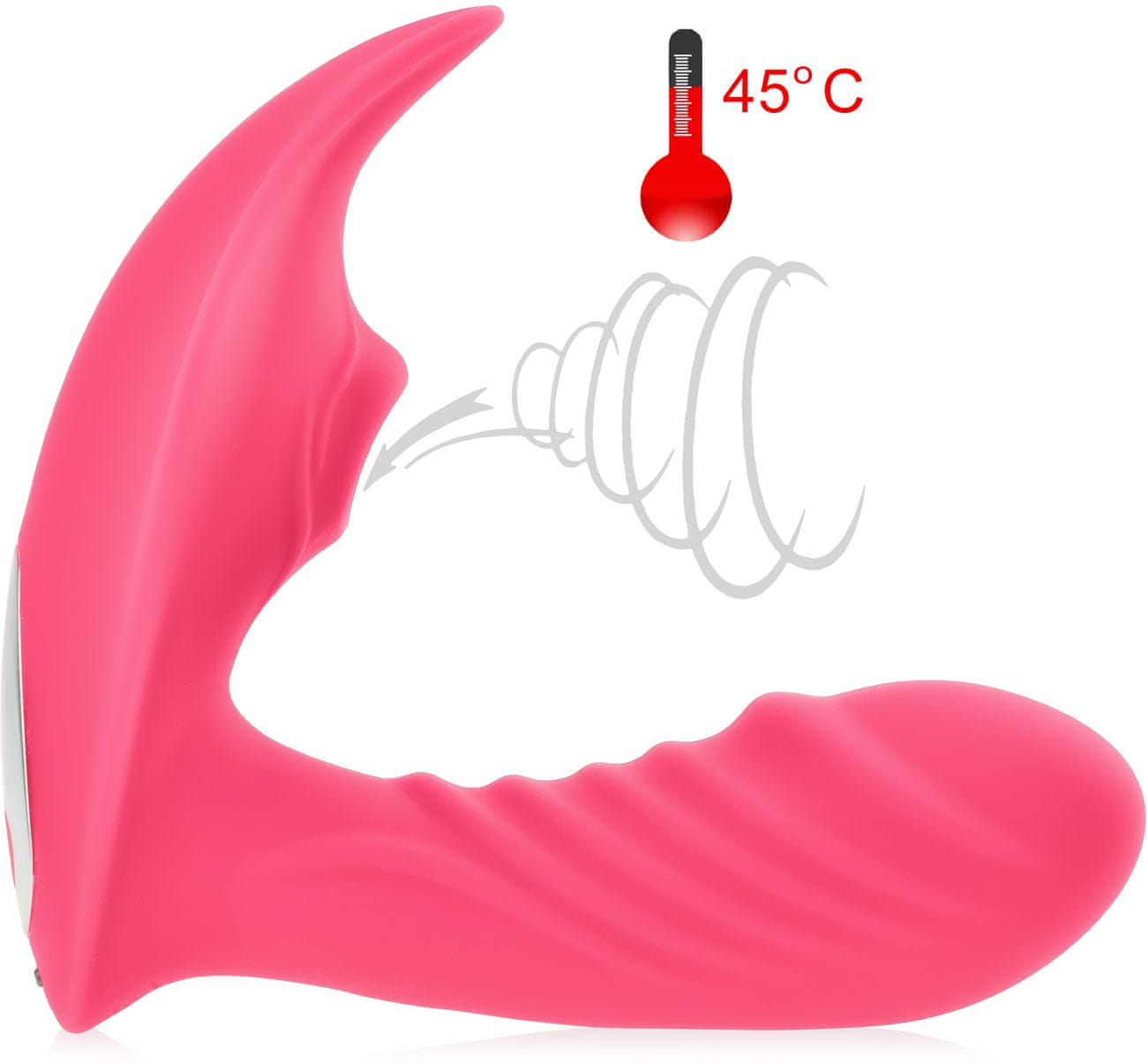Vibrator iz higienskega, hipoalergenega, medicinskega silikona s svilnato gladkim občutkom. Ta vaginalno-klitoralni masažer zagotavlja večdimenzionalni orgazem in intenzivno božanje. Prodorni del ima na površini rebra, ki okrepijo občutke, funkcija segrevanja pa napolni vaše jedro s prijetno toplino in zagotavlja naravno izkušnjo. Del za božanje klitorisa ima funkcijo sesanja in drobne izbokline. Ta kombinacija ustvarja prijeten občutek stiskanja in ščipanja med masturbacijo, tako kot med oralnim seksom. Kombinacija vroče penetracije in intenzivne stimulacije klitorisa vas bo navdušila. Svoje božanje lahko nadzorujete z brezžičnim daljinskim upravljalnikom. Lahko ga tudi izročite partnerju in mu pustite, da nadzoruje vaš užitek. Izdelek je vodoodporen, idealen za mokro igro v kadi ali pod tušem.