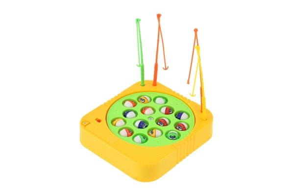 Pustite se popeljati vznemirljivi pustolovščini ribolova. Odlična igra vašega otroka popelje naravnost v globoke vode jezer, morij in oceanov. Tako otroci kot odrasli se bodo ob lovljenju rib zelo zabavali. Zavrtite se po ribniku in ujemite čim več plavajočih rib. Ribe odpirajo in zapirajo usta, zato morate najti pravi trenutek, da jo zasekate. Zmaga igralec z največ ujetimi ribami. Kdo od vas bo to? Igra deluje na baterije: 1× AA, ki niso priložene. Velikost igre: 16 × 17 cm Premer igralnega polja: 14 cm Velikost škatle: 16 × 22 × 3,5 cm Primerno za otroke od 3. leta starosti