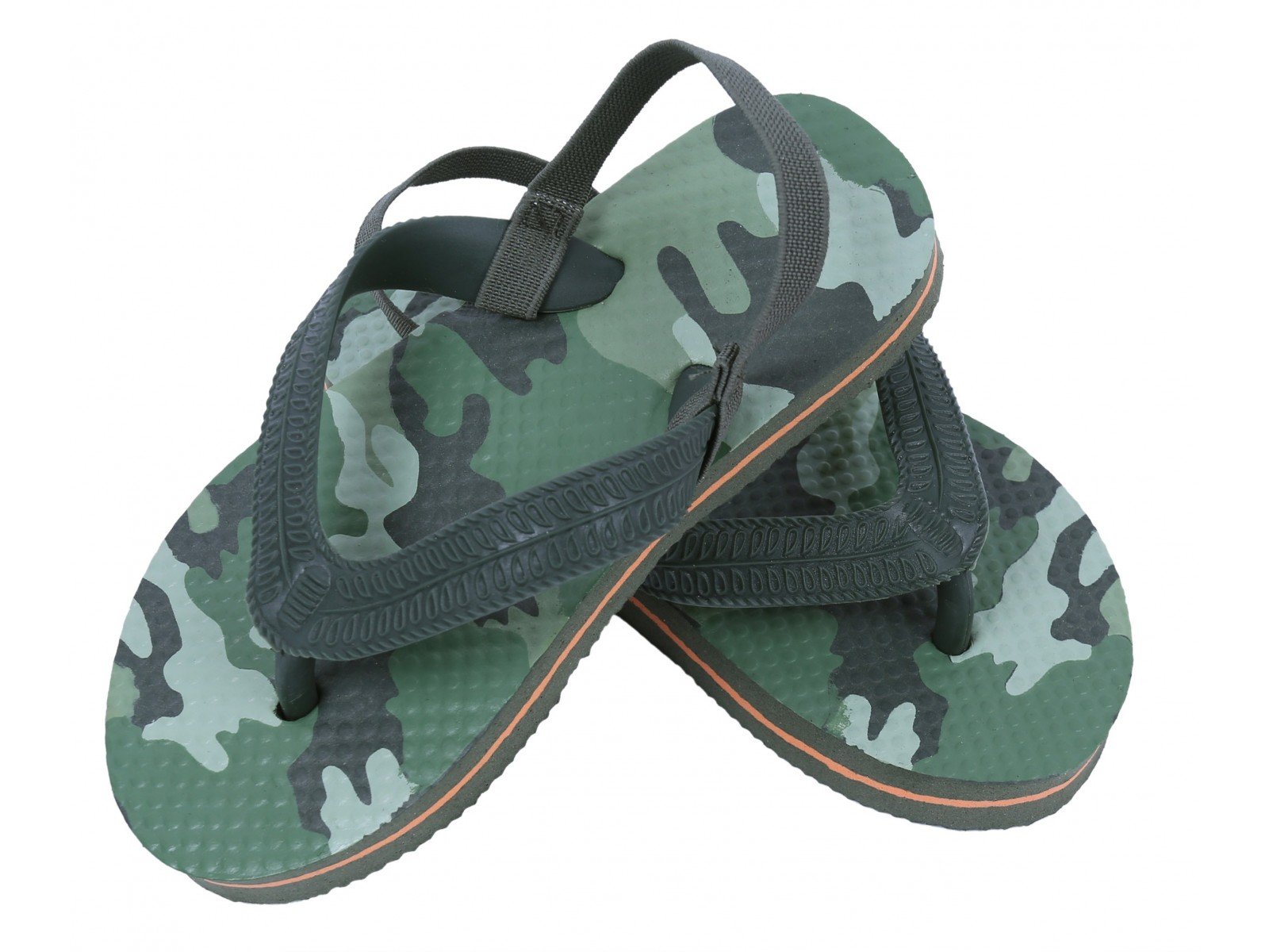 Zelene otroške japonke z maskirnim vzorcem, opremljene z elastičnim trakom na peti, ki zagotavlja stabilnost med nošenjem.