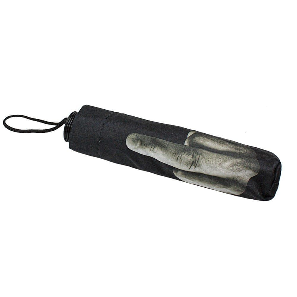 Nihče se ne mara zmočiti, ko dežuje! Vedno bodite pripravljeni s tem pametnim dežnikom, ki je zložljiv in enostaven za prenašanje. Na dežniku je motiv z držo, ki je viden, ko se odpre – motiv je roke, ki bogovom vremena podaja prst. Dežnik se enostavno odpre tako, da ga potegnete iz ročaja. Priložena je zaščitna prevleka za dežnik.