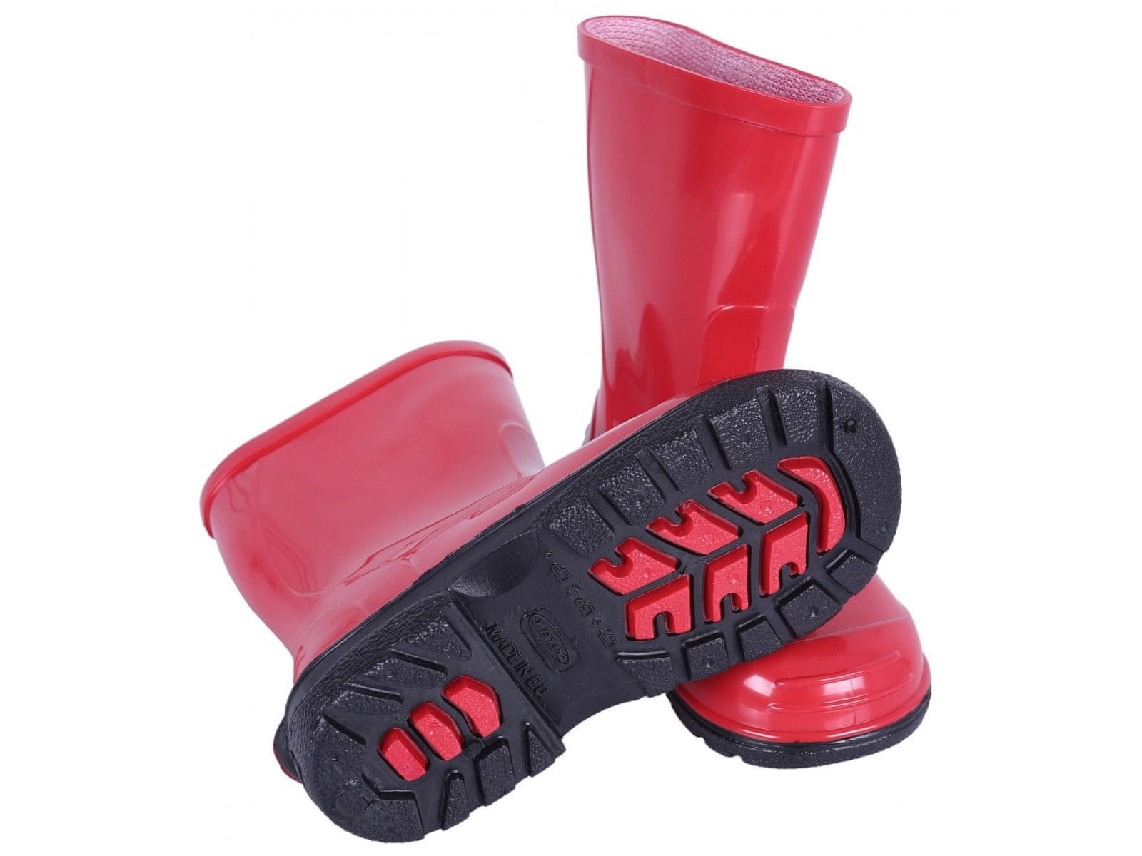 Rdeči, brezčasni dežni škornji za otroke, izdelani na Poljskem.