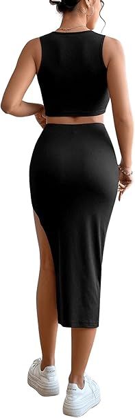 Nikcorp Ženski komplet crop top majica in midi krilo z razporkom, eleganten dvodelni set za zabave, elastičen material, črna barva, S