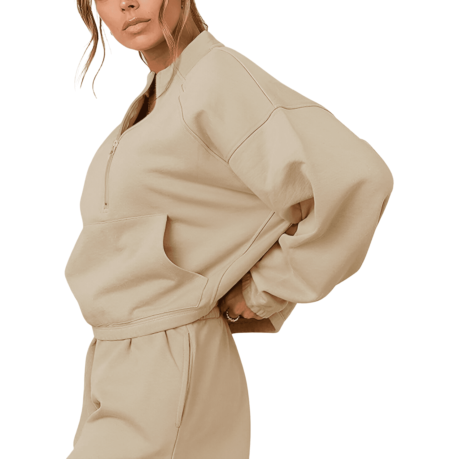 Nikcorp Ženski komplet trenirke s puloverjem na zadrgo in hlačami, udoben bombaž s flisom, športno eleganten, bež, velikost L